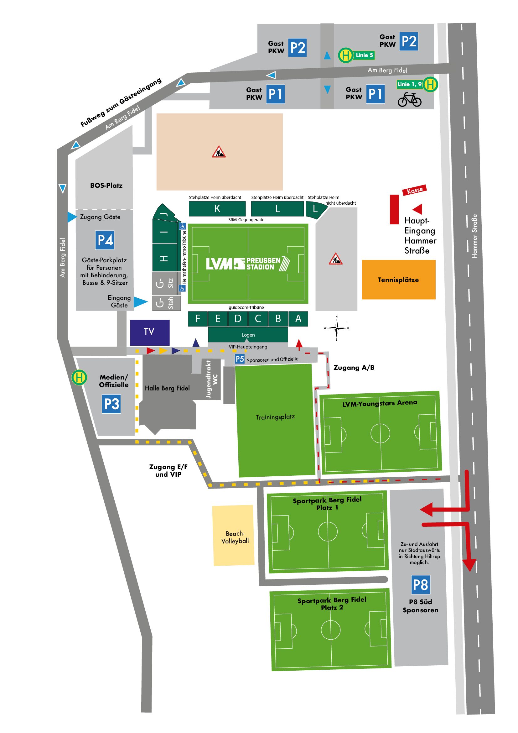 Das LVM-Preußenstadion befindet sich im Umbau und verändert sich täglich. Mögliche Änderungen am Stadionplan sind daher vorbehalten.