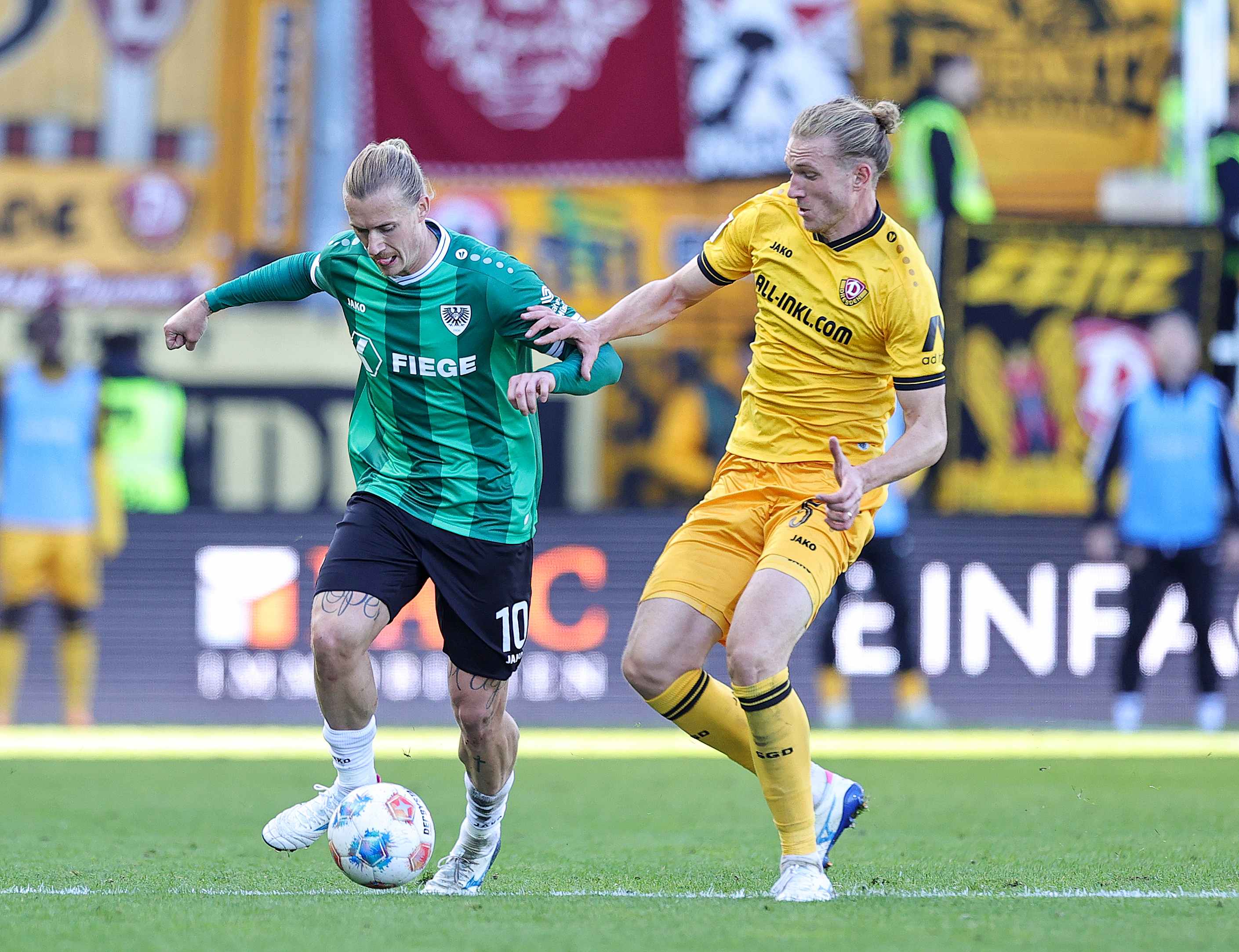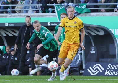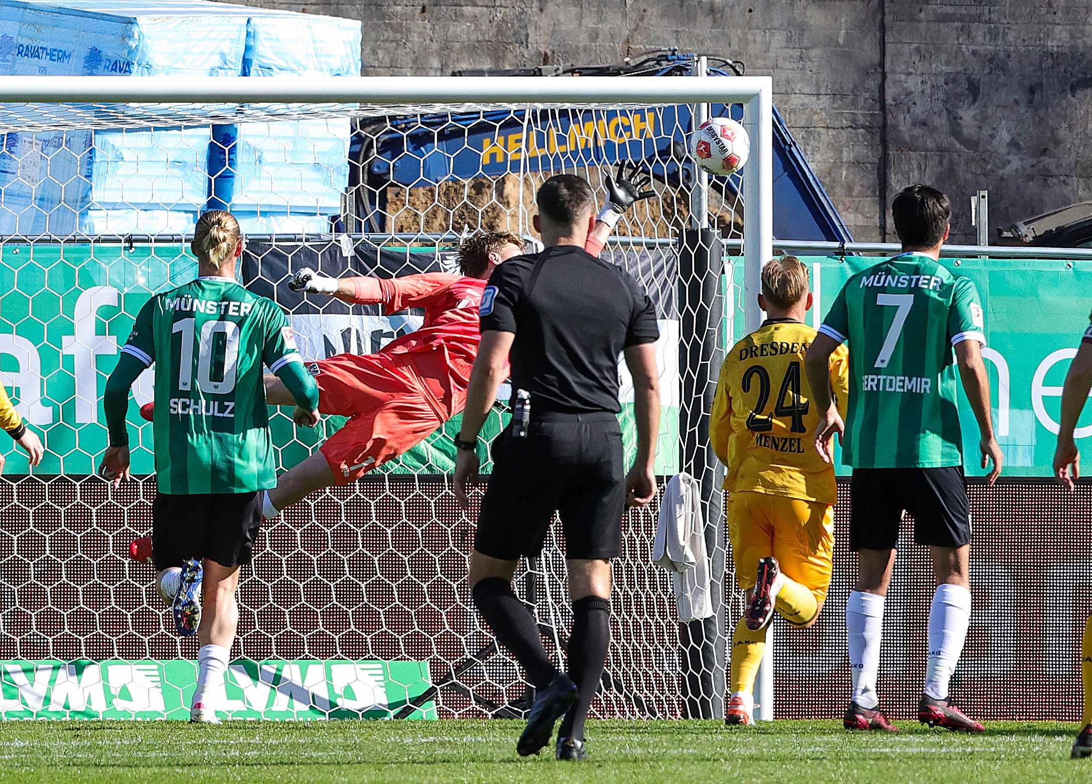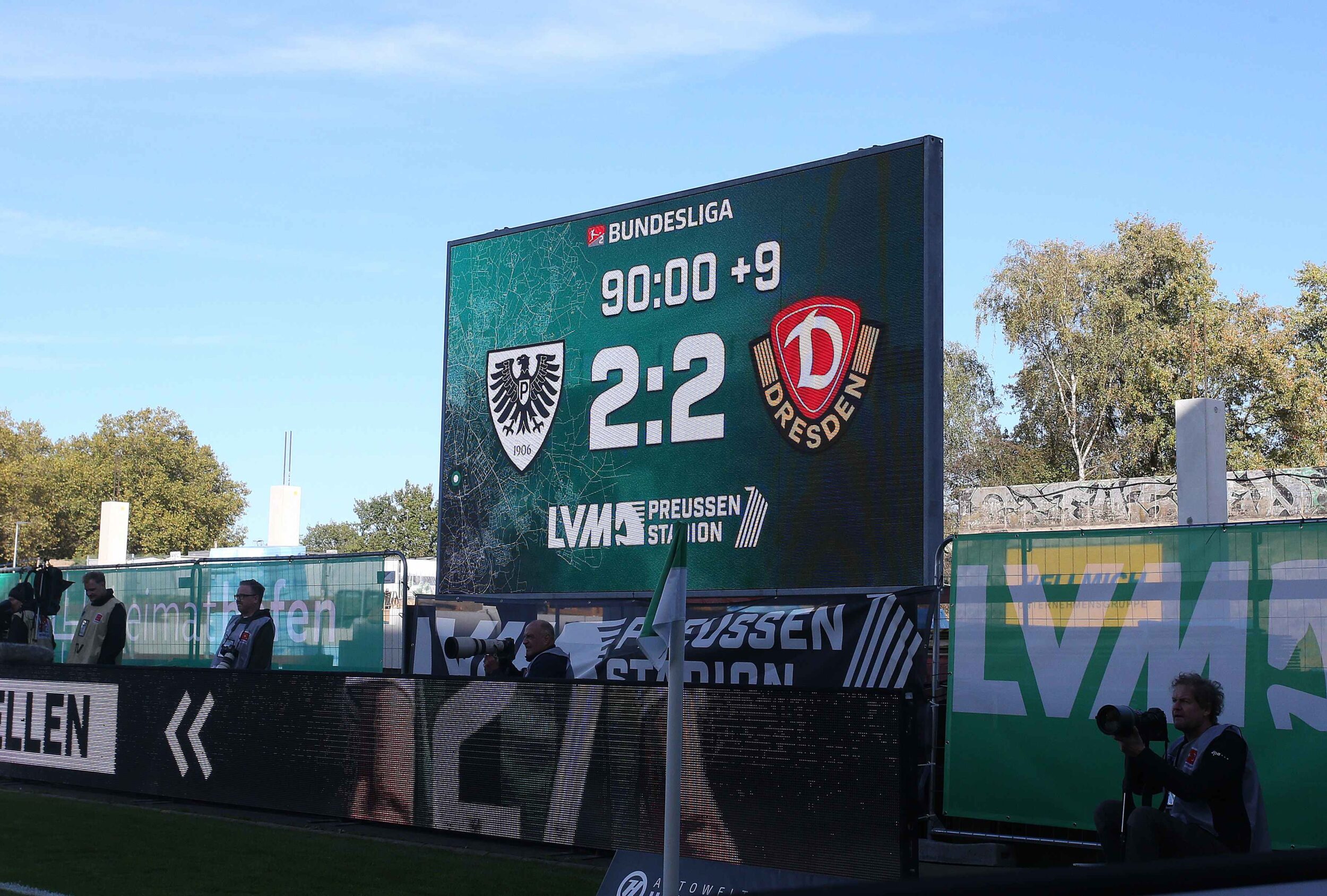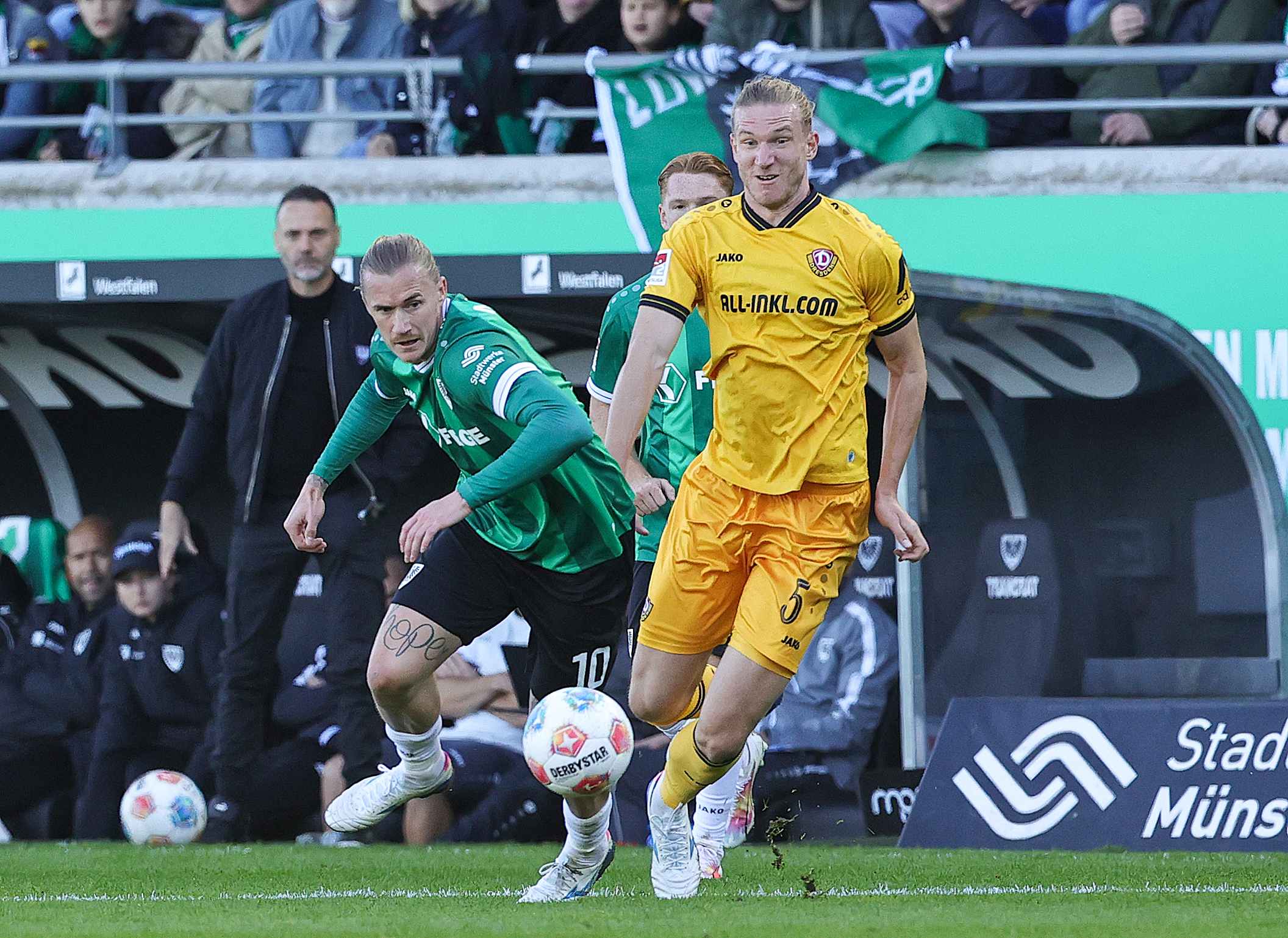 Der SC Preußen muss sich gegen Dynamo Dresden mit einer Punkteteilung begnügen. Vor 10.337 Zuschauern im LVM-Preußenstadion kam die Elf von Alexander Ende nach Rückständen zweimal zurück und holte so ein verdientes 2:2-Unentschieden. Von Anfang an zeigte sich, dass am 9. Spieltag zwei Teams mit offensiver Ausrichtung aufeinandertrafen. Gute Gelegenheiten ergaben sich auf beiden Seiten, wobei Lokotschs abgefälschter Schuss an die Latte dem Tor am nächsten kam (16.). In der 20. Minute zappelte dann plötzlich der Ball im Preußennetz, der Dresdner Menzel behinderte Schenk jedoch in der Szene regelwidrig und Referee Tom Bauer ahndete das. Nur vier Minuten später gab es nichts am Gegentor auszusetzen. Der Ex-Münsteraner Alexander Rossipal verwandelte einen direkten Freistoß sehenswert zur Gästeführung.