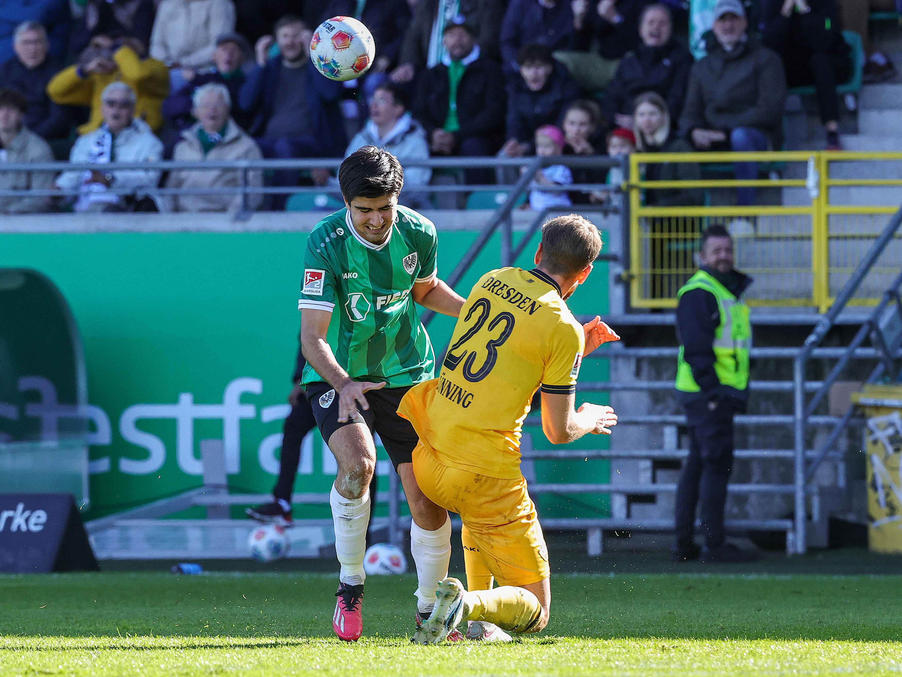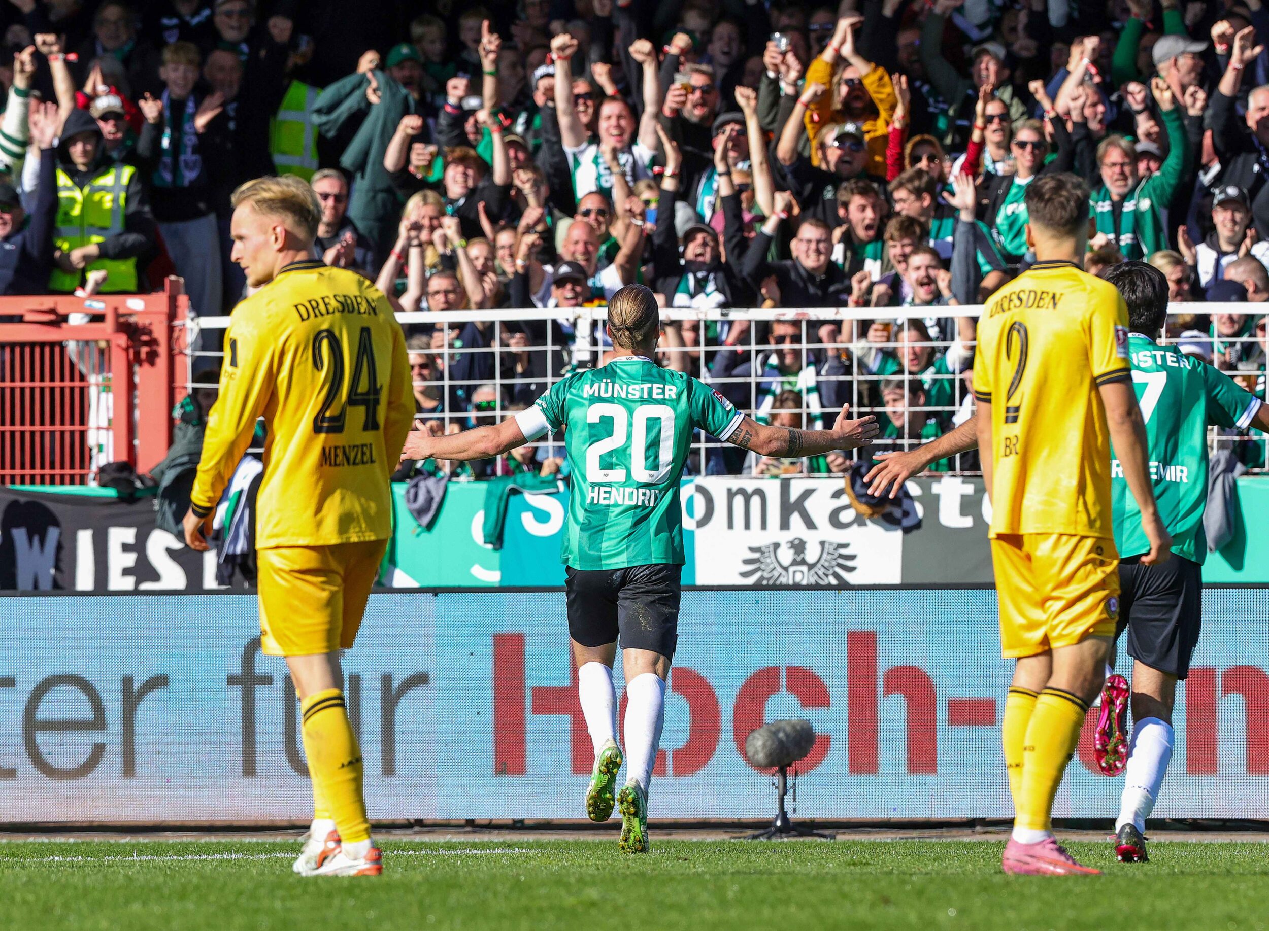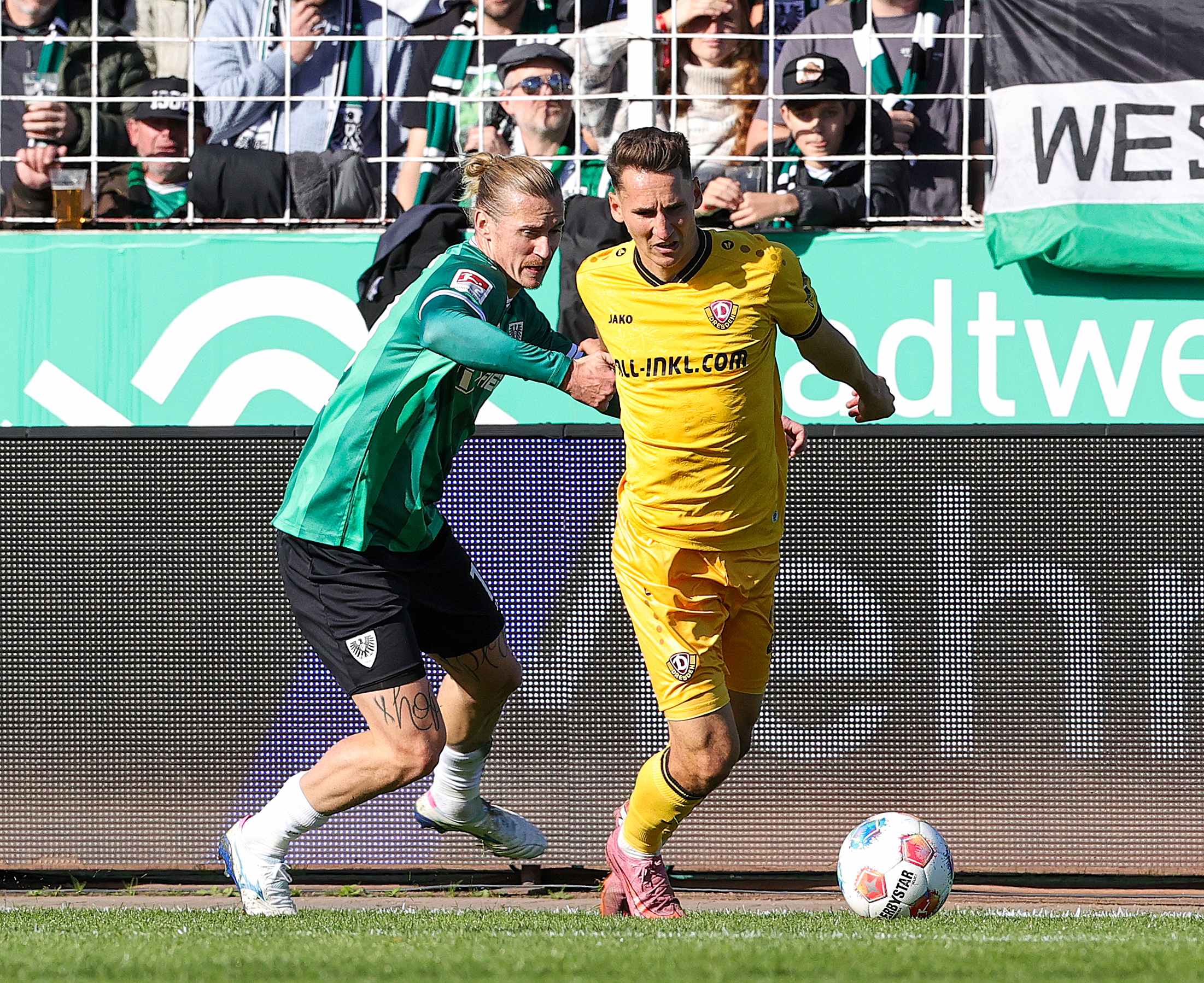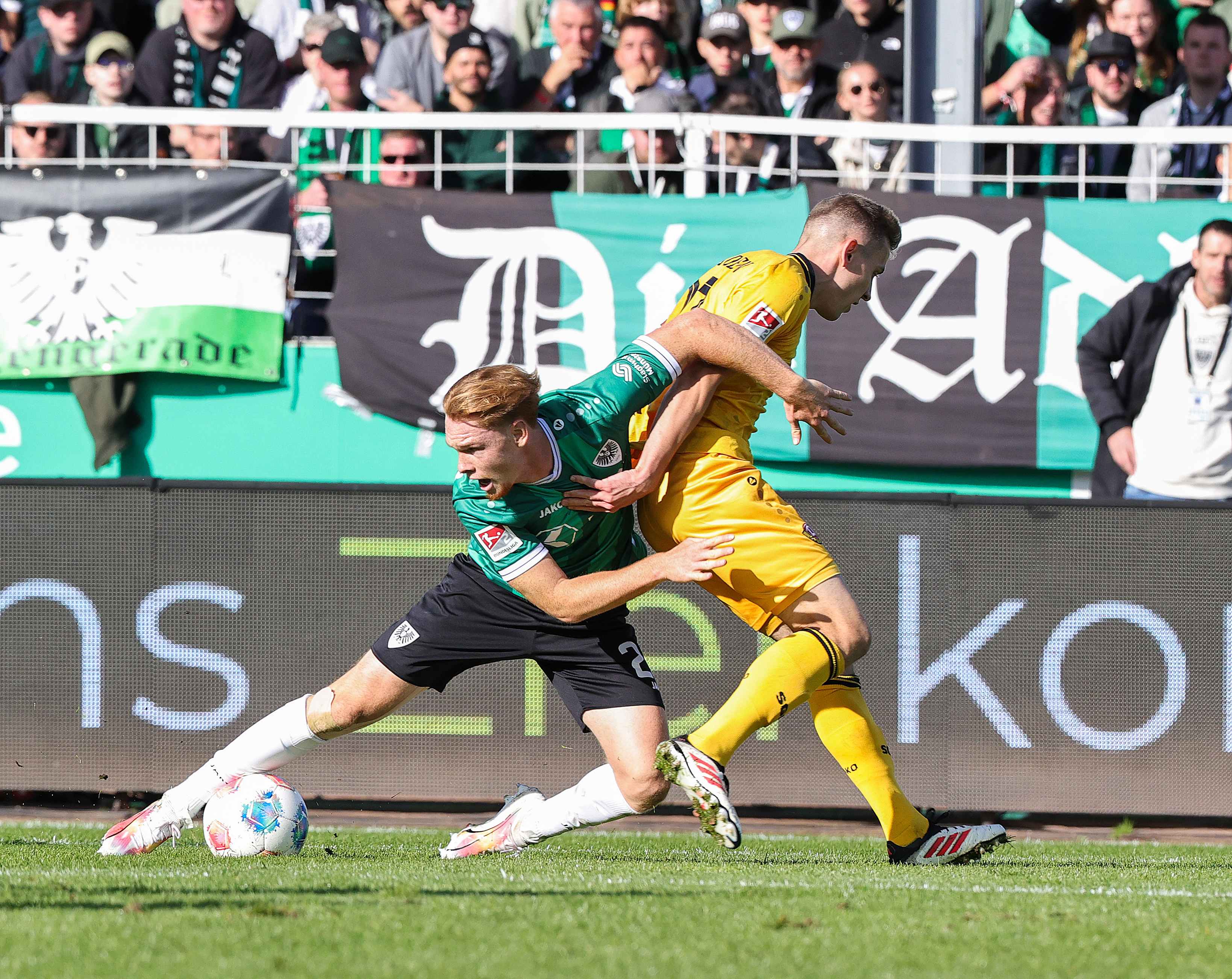Der SC Preußen muss sich gegen Dynamo Dresden mit einer Punkteteilung begnügen. Vor 10.337 Zuschauern im LVM-Preußenstadion kam die Elf von Alexander Ende nach Rückständen zweimal zurück und holte so ein verdientes 2:2-Unentschieden. Von Anfang an zeigte sich, dass am 9. Spieltag zwei Teams mit offensiver Ausrichtung aufeinandertrafen. Gute Gelegenheiten ergaben sich auf beiden Seiten, wobei Lokotschs abgefälschter Schuss an die Latte dem Tor am nächsten kam (16.). In der 20. Minute zappelte dann plötzlich der Ball im Preußennetz, der Dresdner Menzel behinderte Schenk jedoch in der Szene regelwidrig und Referee Tom Bauer ahndete das. Nur vier Minuten später gab es nichts am Gegentor auszusetzen. Der Ex-Münsteraner Alexander Rossipal verwandelte einen direkten Freistoß sehenswert zur Gästeführung.