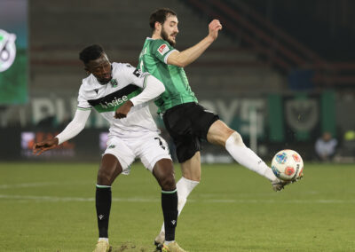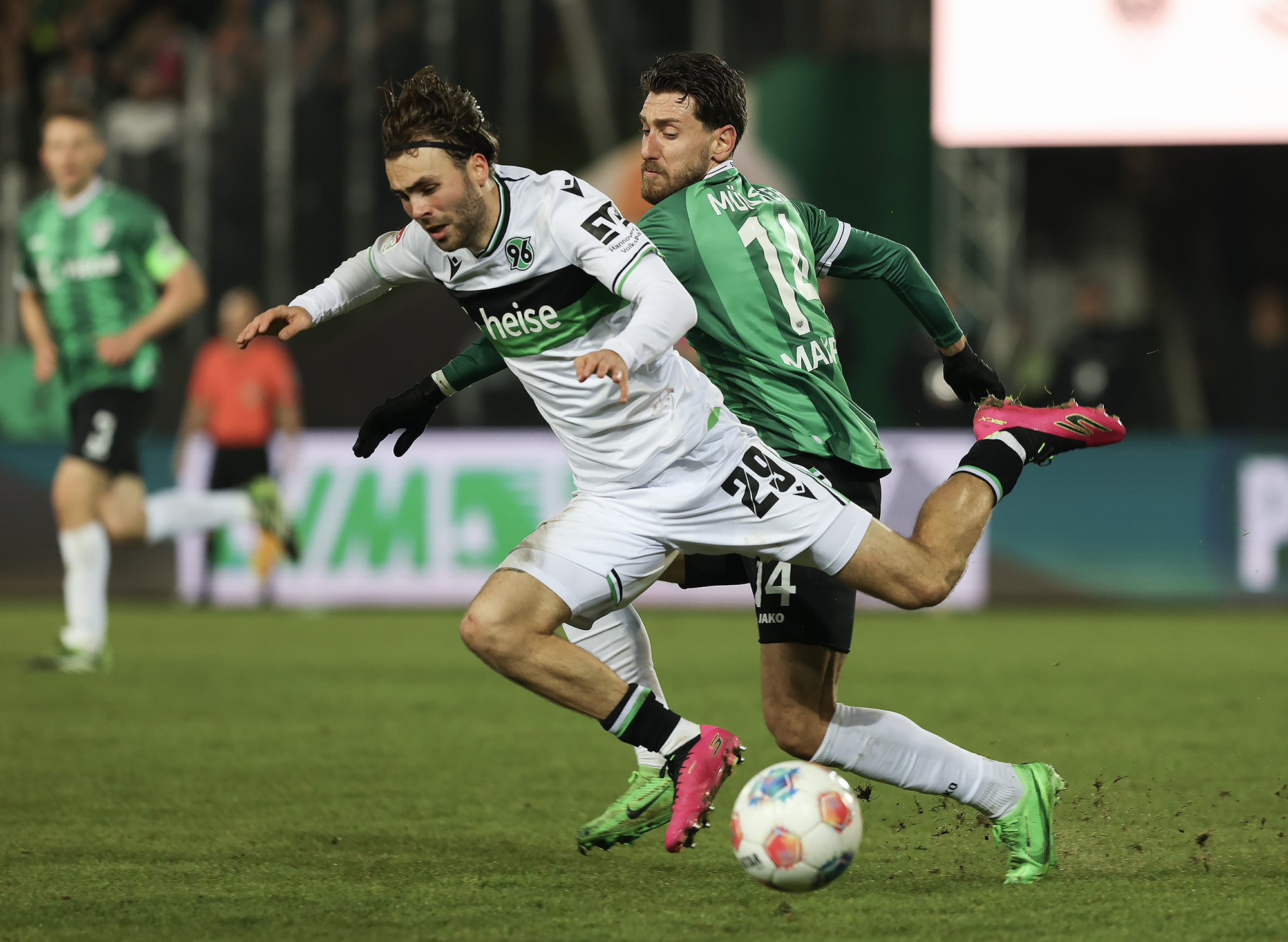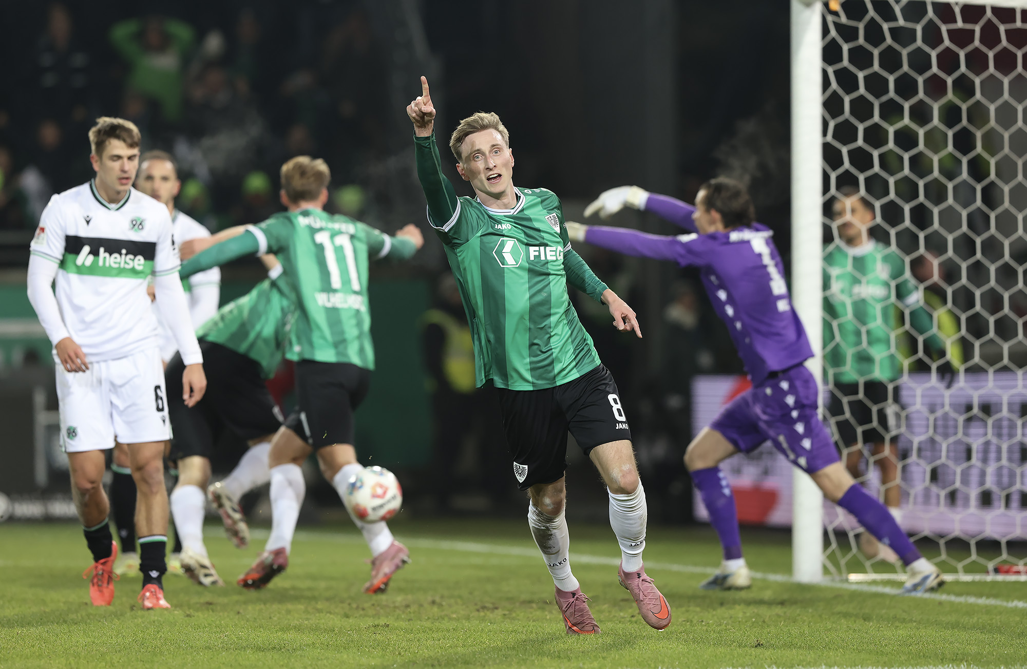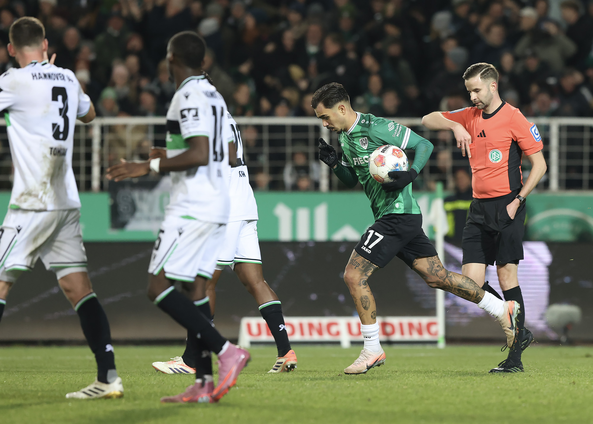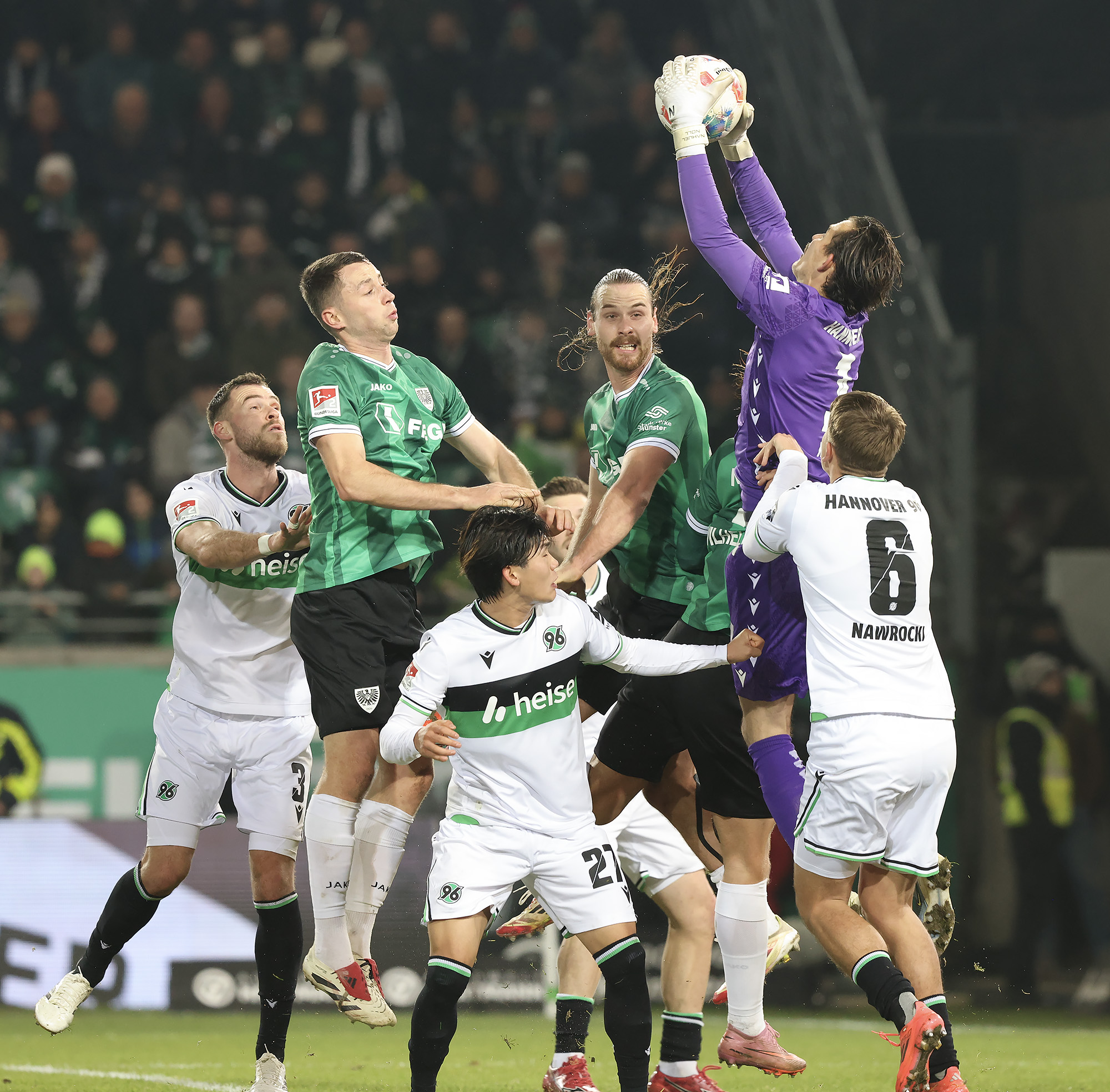 Gewillt, den Rückstand wie in der Vorwoche in einen Sieg umzuwandeln, kamen die Preußen energisch aus der Kabine. Aus spitzem Winkel erwischte Mees nur das Außennetz (47.), bei seinem zweiten Versuch aus der Distanz fehlte ebenfalls nicht viel (60.). Gleichzeitig ergaben sich so Räume für temporeiche Vorstöße Hannovers – nach genau so einem Muster verpasste es der in der Mitte freistehende Källman auf 0:2 zu stellen (51.). Dafür sorgte zwanzig Minuten später der eingewechselte Daisuke Yokota, der nach starker Einzelleistung von Kolja Oudenne den Ball über die Linie drückte. Ein herber Nackenschlag für die Preußen, die in der Folge aber nicht aufsteckten. Die Mannschaft von Alexander Ende warf noch einmal alles nach vorne, schien jedoch entweder am Querbalken (Batista Meier, 77.) oder am Hannoveraner Schlussmann Nahuel Noll (Charalambos Makridis, 84.) zu verzweifeln. Vieles deutete auf die zweite Heimniederlage der Saison. Was folgte, war jedoch der absolute Preußenwahnsinn. Batista Meier, der den Gäste-Keeper per Strafstoß überwand, machte die Partie nochmal spannend (90.+1), bevor Zidan Sertdemir mit seinem ersten Tor als Adlerträger das Stadion explodieren ließ (90.+6). Ein Punktgewinn, der aufgrund des hohen Investments in der Schlussphase mehr als in Ordnung geht.