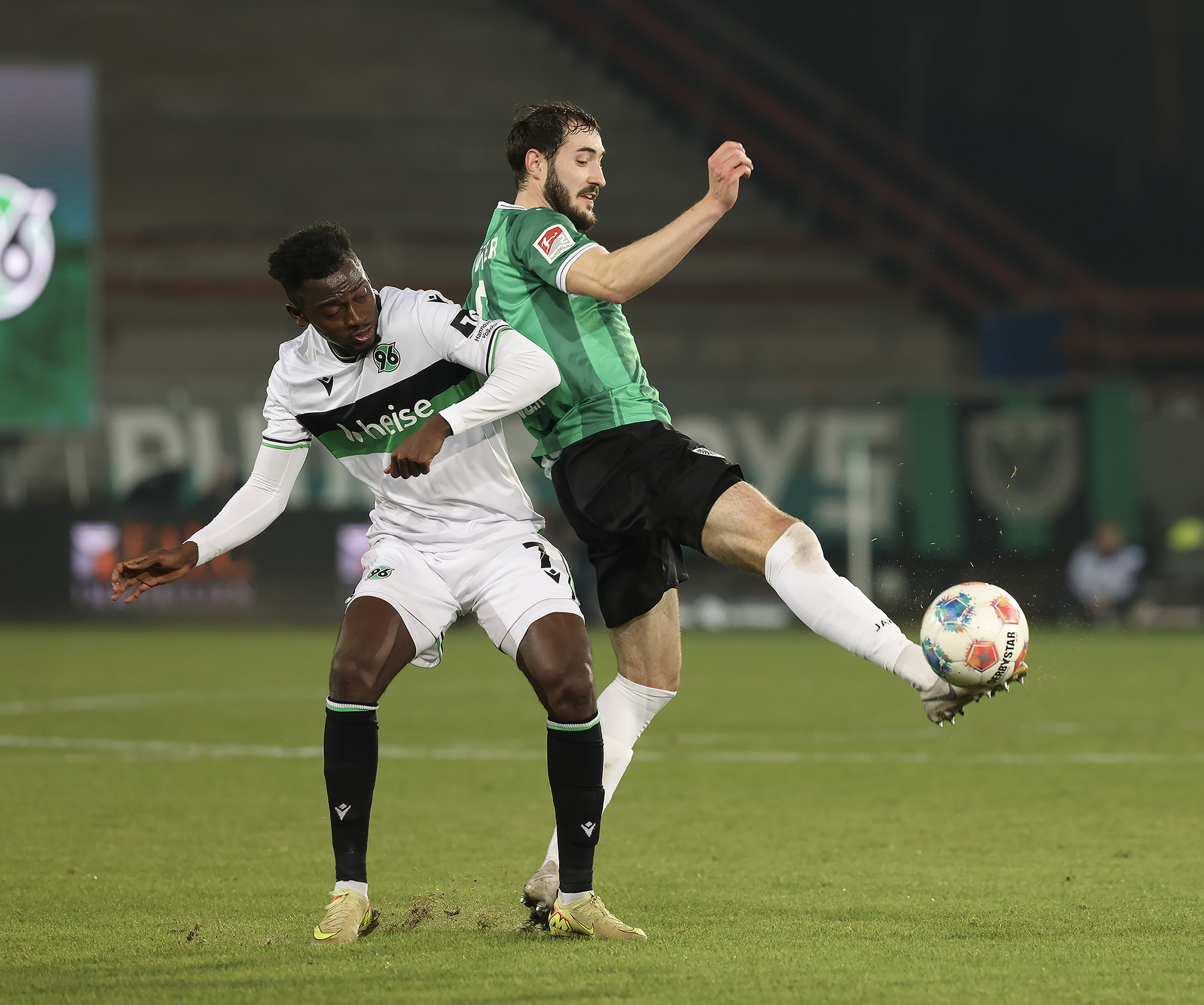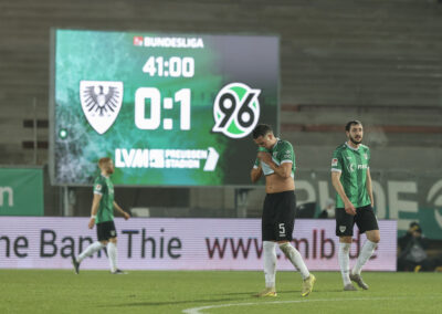 Dabei ging es vor ausverkauftem Haus zunächst recht zäh zugange: Beide Mannschaften waren um Spielkontrolle bemüht, jedoch ohne die notwendige Durchschlagskraft zu erzeugen. In der 19. Spielminute gelang es den Adlerträgern dann einen schönen Angriff bis zur gegnerischen Grundlinie vorzutragen – den der heranstürmende Torge Paetow zum vermeintlichen 1:0 vollendete. Der Jubel fiel aber nur kurz aus, denn Vorlagengeber Oliver Batista Meier stand beim Tiefenpass von Joshua Mees im Abseits. Anschließend setzte der SCP zwar immer wieder offensive Akzente, gefährlich wurde es jedoch selten. Dafür schien der defensive Plan von Trainer Alexander Ende voll aufzugehen, da die abschlussstarke Offensive der Hannoveraner kaum zur Entfaltung kam. Bis in der 41. Minute sich die sonst stabile Preußenverteidigung bei einem langen Ball verschätzte – 96-Stürmer Benjamin Källman bedankte sich und schob zur 0:1-Pausenführung der Gäste ein.
