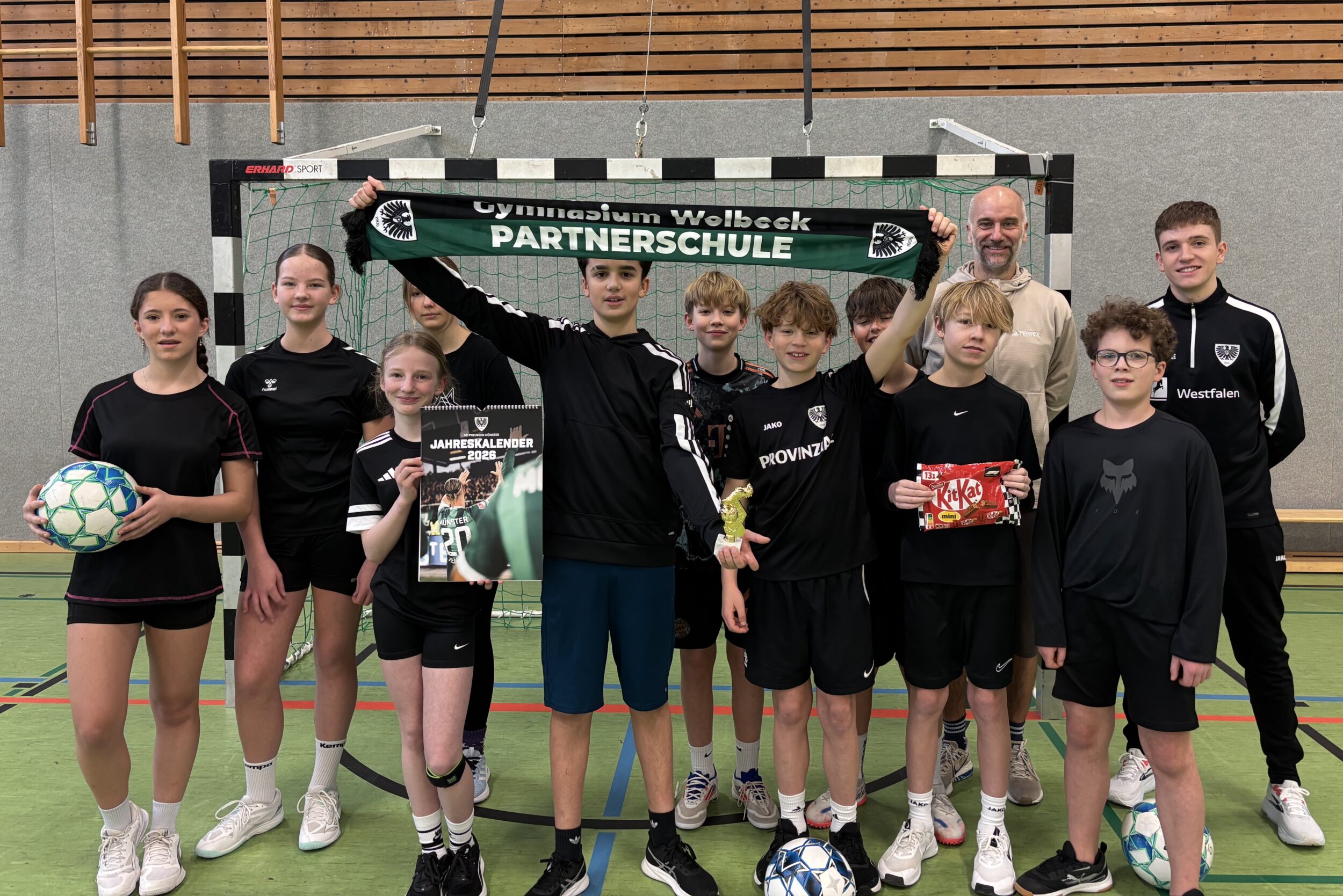 Anfang Februar fand im Gymnasium Wolbeck, langjährige Partnerschule des SC Preußen Münster, erneut der große Fußballtag statt, der für alle Beteiligten zu einem besonderen sportlichen Erlebnis wurde. Von der ersten bis zur vierten Stunde übernahmen Preußen-Jugendtrainer das Training der Klassen. Mit viel Engagement gestalteten sie ein abwechslungsreiches und vielseitiges Fußballtraining, das bei den Schülerinnen und Schülern für große Begeisterung sorgte. Besonders beliebt waren die Spielformen „Tic Tac Toe“ und „Zahlenfußball“, die nicht nur fußballerisches Können, sondern auch Teamgeist und Schnelligkeit forderten.