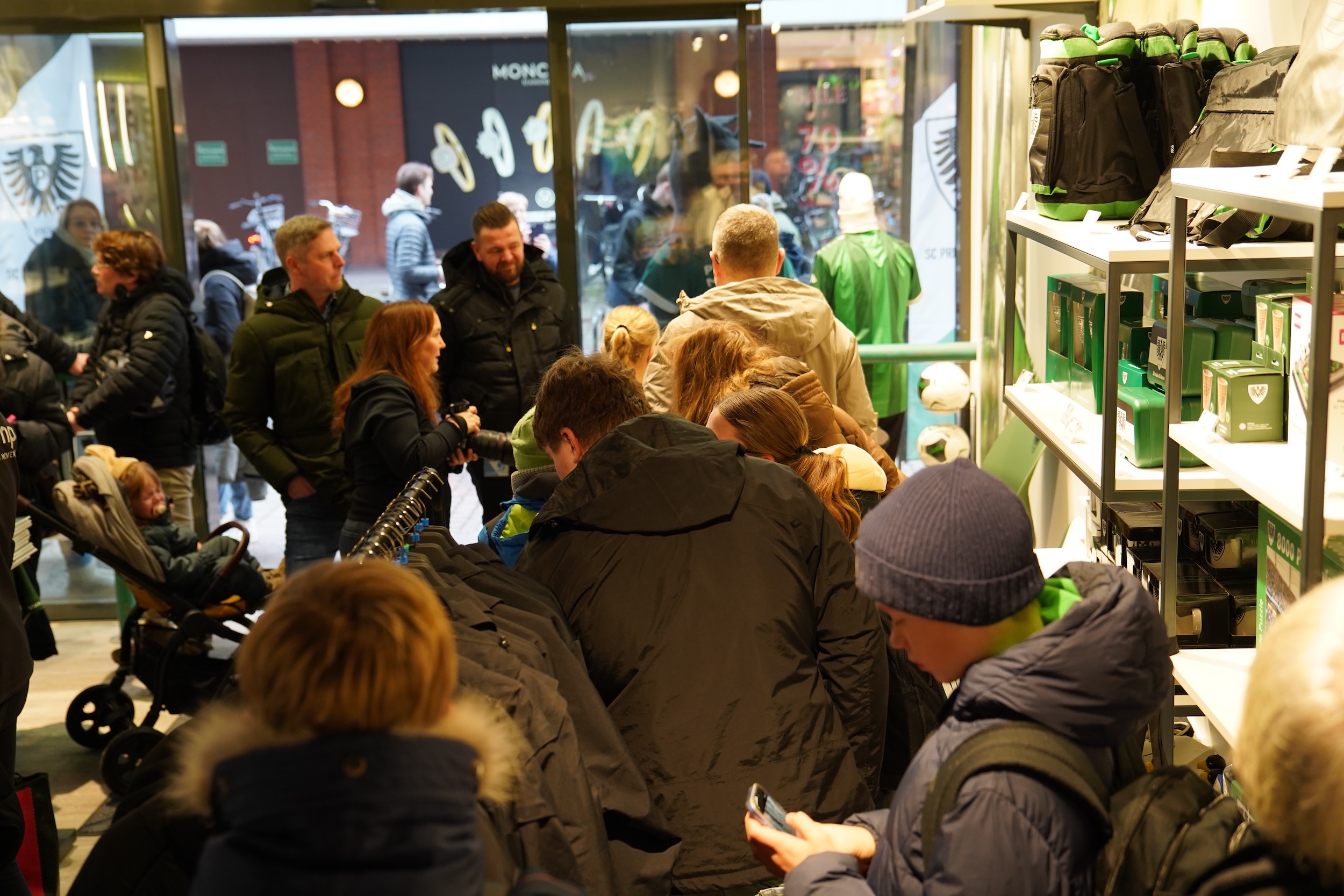 Am Freitag wurde die zweite Etage des Fanshops an der Klemensstraße offiziell eröffnet und lockte über den gesamten Tag zahlreiche Besucher an. Schon eine gute Stunde vor Ladenöffnung warten die ersten Neugierigen vor der Tür, um einen Blick auf die Erweiterung der Ladenfläche zu werfen. Über den gesamten Freitag hinweg tummelten sich schließlich zahlreiche Preußenfans im Laden und nutzten die verlockenden Sonderangebote. Außerdem sorgten die Autogrammstunde mit Malik Batmaz und der Besuch von Maskottchen Fiffi für großen Andrang in der Innenstadt.