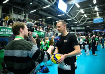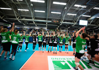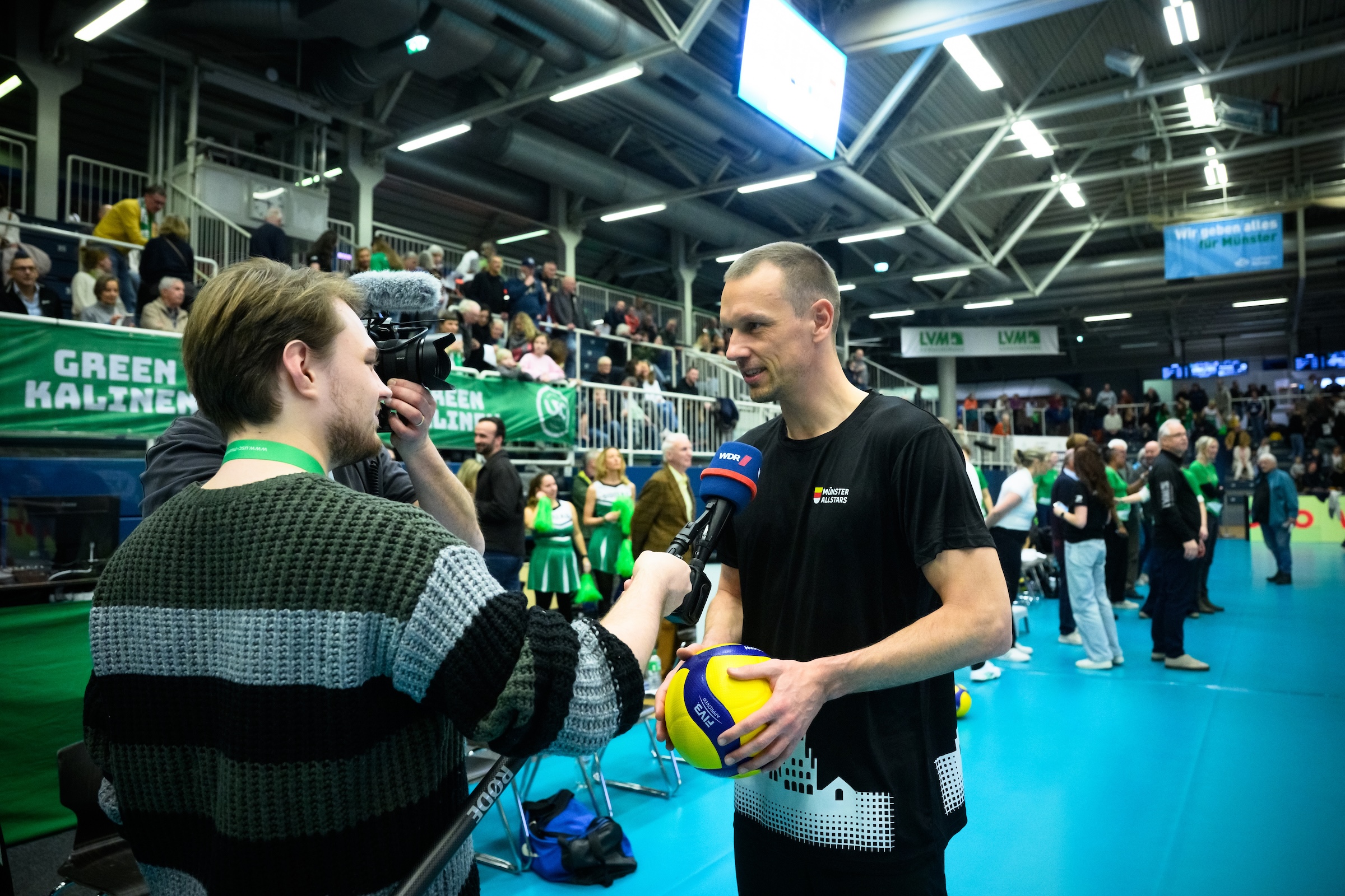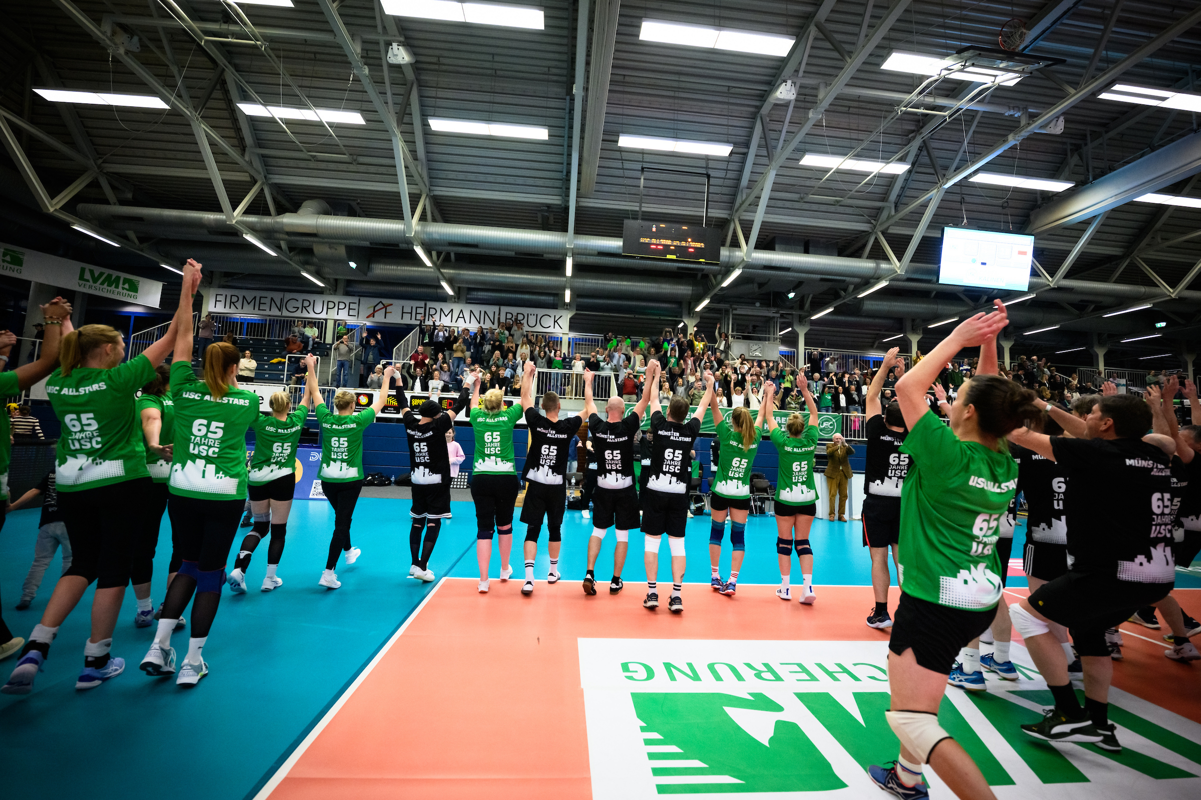 Spitzensport in Münster findet nicht nur im LVM-Preußenstadion statt – er lebt auch wenige Schritte entfernt in der Halle Berg Fidel, wo seit einigen Jahren die Uni Baskets die Zuschauer in der 2. Basketball-Bundesliga Pro A begeistern. Schon deutlich länger auf dem Parkett unterwegs ist der USC Münster, dessen Damen-Volleyball-Mannschaft zu den erfolgreichsten des ganzen Landes gehört. 65 Jahre besteht der Nachbar der Adlerträger nun; das Jubiläum wurde vergangenen Samstag gebührend mit einem Showmatch zelebriert. Einer Allstar-Auswahl der „Green Kalinen“ stellte sich ein Promi-Team entgegen, zusammengesetzt aus Münsteraner Größen aus Politik, Wirtschaft und Sport. Mit von der Partie war auch Ole Kittner, Geschäftsführer Sport des SC Preußen, der mit seinem Team am Ende den Kürzeren zog, jedoch viel Gefallen an dem Jubiläumsspiel fand.