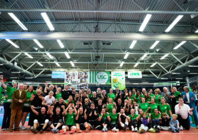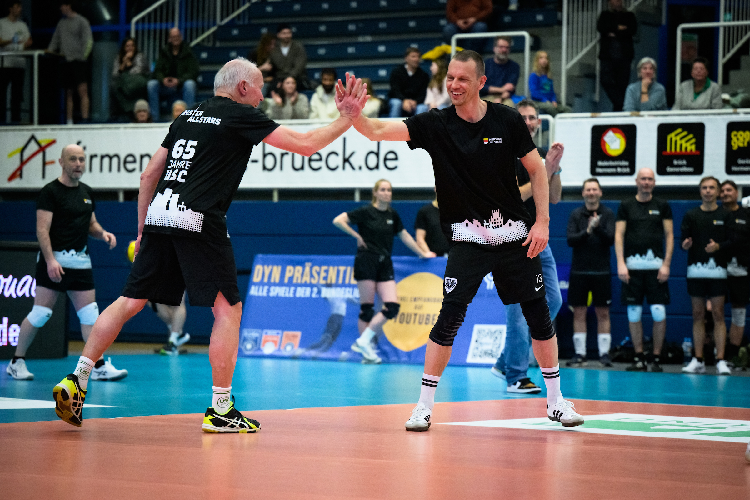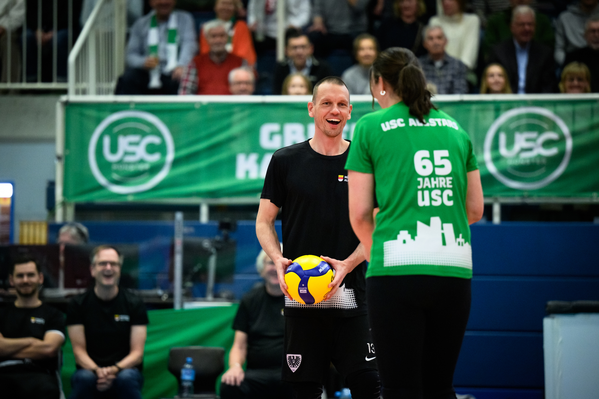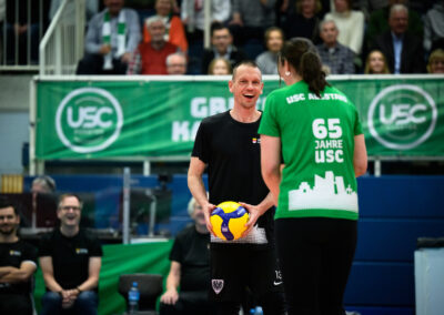 Vor mehr als 1.000 Zuschauern lieferten sich die Münsteraner Größen, angeführt von Oberbürgermeister Tilman Fuchs, einen offenen Schlagabtausch mit dem Allstar-Team des USC. Auch dank einer Zusatzregelung, wonach die Allstar-Truppe um Kapitänin Johanna Thewes lediglich zwei statt drei Ballkontakte nutzen durfte, ergaben sich unterhaltsame Ballwechsel und ein durchaus spannendes Duell. Letztlich setzte sich die Klasse der früheren Meisterinnen aber gegen Kittner und Co. durch. Der USC gewann mit 3:0 – doch im Mittelpunkt standen ohnehin das Wiedersehen alter Mannschaftskolleginnen und das starke Zeichen des Zusammenhalts lokaler Kräfte am Berg Fidel.