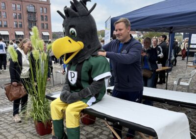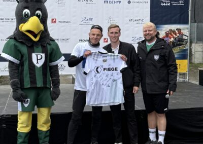 Im Mittelpunkt der Regatta standen nicht nur der sportliche Ehrgeiz, sondern vor allem das Miteinander und das gemeinsame Ziel, Krebspatientinnen und -patienten Mut zu machen. Ob auf dem Wasser oder am Ufer – überall war die Begeisterung und das Engagement der Teilnehmenden spürbar. Das bunte Rahmenprogramm, kulinarische Angebote und zahlreiche Mitmachaktionen sorgten für beste Stimmung bei allen Beteiligten. Überraschungsgast war Preußenspieler Joshua Mees, der fleißig Autogramme schrieb. Auch Fiffi, das Maskottchen der Adlerträger, war ein beliebtes Fotomotiv. Die Versteigerung zweier unterschriebener Preußen-Trikots brachte insgesamt 1200 Euro an zusätzlichen Spendeneinnahmen.