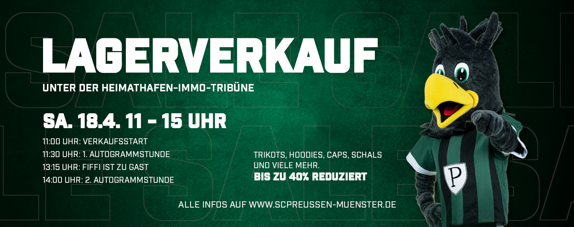 Dort, wo sonst tausende Fans für Stimmung sorgen, steigt am kommenden Samstag eine ganz besondere Verkaufsaktion: Unterhalb der Heimathafen-Immo-Tribüne findet einen Tag vor dem Auswärtsspiel auf Schalke zwischen 11 Uhr und 15 Uhr unser großer Lagerverkauf statt, bei dem ihr euch für das Saisonfinale noch einmal mit zahlreichen Artikeln aus unserem Merchandising-Sortiment eindecken könnt. Pullover, Shirts, Jacken, Schals, Caps, Taschen uvm. wandern mit bis zu 40% Nachlass in eure Einkaufstaschen. Und wer noch immer kein Preußentrikot im Schrank hat, sollte jetzt zuschlagen. Heim- und Auswärtstrikots sind für 50 Euro (Kindertrikots 45 Euro) erhältlich. Auf den Flock gibt es außerdem 10 Euro Nachlass.