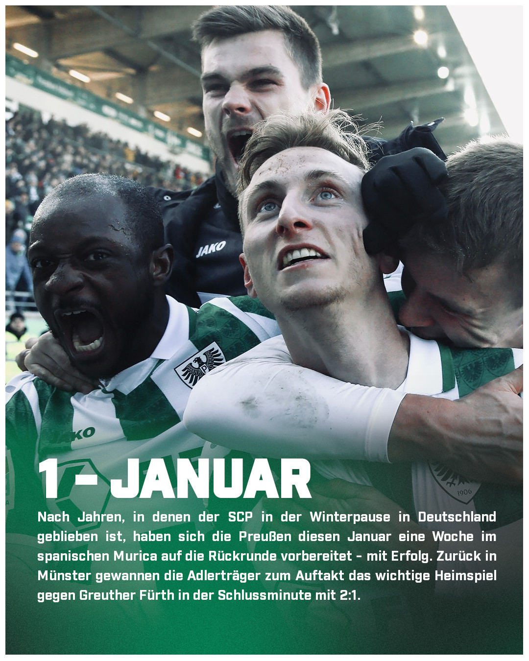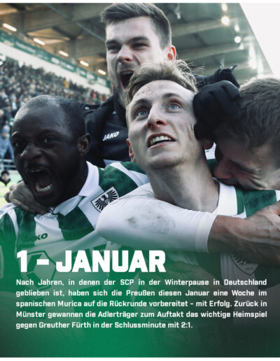 Preußen international! Im spanischen Murcia hat sich der SC Preußen auf die Rückserie vorbereitet. Immer mit dem großen Ziel vor Augen: Den Klassenerhalt in der 2. Bundesliga zu schaffen. Mit 16 Punkten standen die Adlerträger zum Jahresauftakt zwar über dem Strich, doch allen war klar: Der Weg ist noch weit. Um sich genau auf diese große Aufgabe vorzubereiten, fanden die Adlerträger unter der andalusischen Sonne Spitzenbedingungen vor. Zurück in Deutschland, wurde gleich ein wichtiger Grundstein gesetzt: Im Heimspiel gegen Greuther Fürth köpfte Joshua Mees den SCP in der letzten Minute zum wichtigen Sieg! Ein Start nach Maß, der den Glauben an den Ligaverbleib weiter befeuerte.