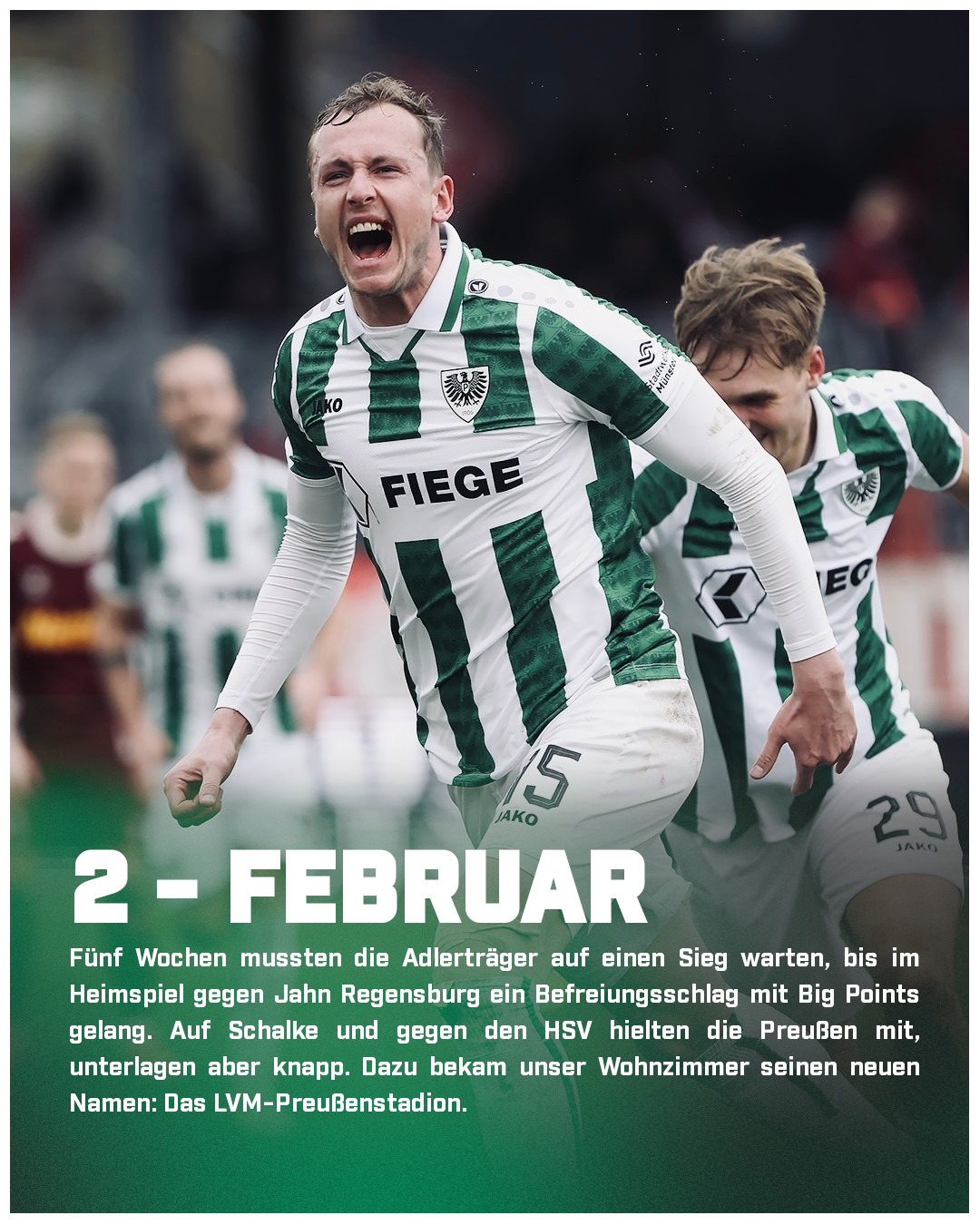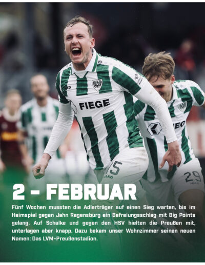 Der nächste Sieg ließ im Abstiegskampf in der Folge etwas auf sich warten – fünf Wochen, um genau zu sein. Vor heimischer Kulisse bezwang der SCP mit Jahn Regensburg (2:0) den nächsten Konkurrenten und sammelte wichtige Zähler. Auch gegen die großen Namen hielten die Schwarz-Weiß-Grünen mit, verloren jedoch nach Führung gegen den späteren Aufsteiger Hamburger SV mit 1:2 und auf Schalke trotz 6.000 mitgereister Fans mit 0:1. Eine wichtige Entscheidung fiel im Februar zudem abseits des Platzes. Unser Wohnzimmer, das Städtische Stadion an der Hammer Straße, erhielt seinen neuen offiziellen Namen: Das LVM-Preußenstadion.