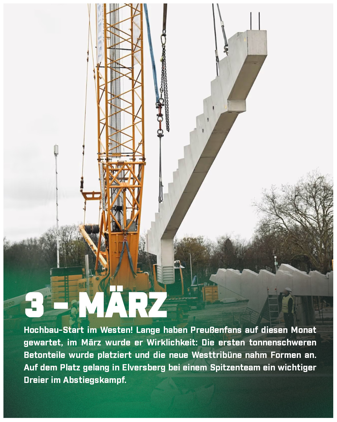 Zurück zum Sport: Genau dann, als es im Tabellenkeller eng wurde, hatte die Mannschaft die richtige Antwort parat – gegen ein echtes Spitzenteam. In Elversberg sorgte Simon Scherder mit seinem 1:0-Siegtreffer für ganz wichtige Punkte im Abstiegskampf. Wie wichtig dieser Erfolg war, sollte sich den folgenden Wochen herausstellen. Ende März folgte zuhause ein weiterer wichtiger Punkt beim 1:1 gegen Braunschweig. Die Augen reiben mussten sich alle Preußenfans aber vor allem beim Blick in die Westkurve. Der Hochbau der neuen Tribüne begann und die ersten tonnenschweren Betonteile flogen ein. Ein Meilenstein.