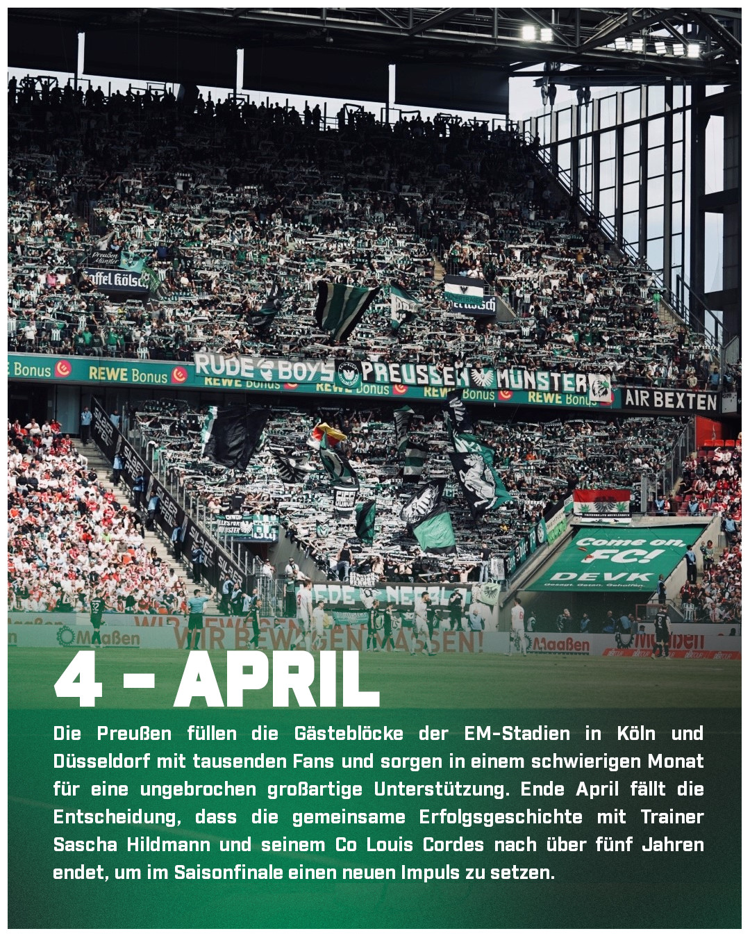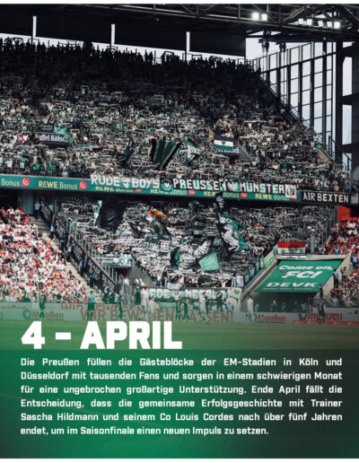 An Highlight-Spielen mangelte es in dieser hochkarätigen 2. Bundesliga nicht. Nach Hamburg, Berlin und Gelsenkirchen füllten die treuen Preußen-Anhänger im April die Blöcke der EM-Stadien in Düsseldorf und Köln. Das waren besondere Momente, wenn man zwei Jahre zurückdenkt, als die Adlerträger in der Regionalliga am Ball waren. Sportlich war es allerdings ein schwieriger Monat: 0:1 in Düsseldorf, 1:3 beim Effzeh, dazu zwei Unentschieden zu Hause gegen Karlsruhe und Darmstadt (je 1:1). Unterdessen punktete die Konkurrenz stark und setzte die Preußen, die jetzt fünf Punkte hinter dem ersten Nicht-Abstiegsplatz lagen, unter Druck. Es folgte die Entscheidung, dass der gemeinsame Erfolgsweg mit Trainer Sascha Hildmann und seinem Co Louis Cordes nach über fünf Jahren ein Ende fand.