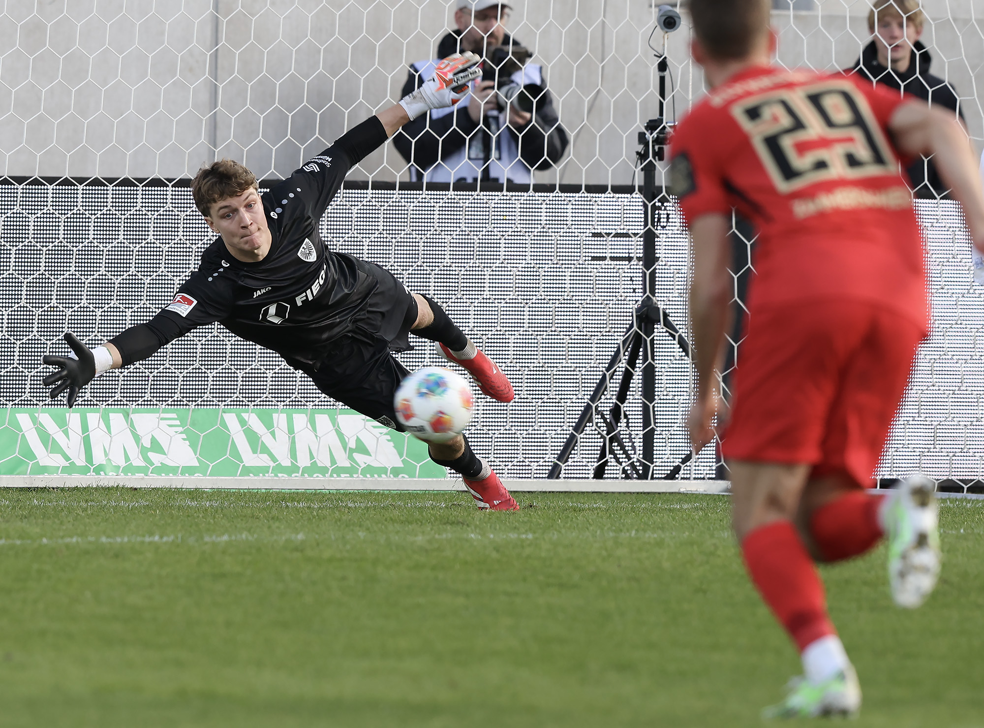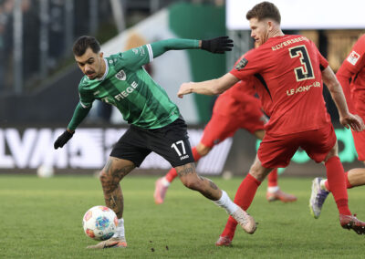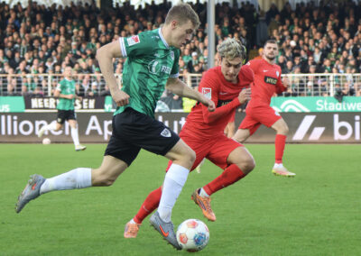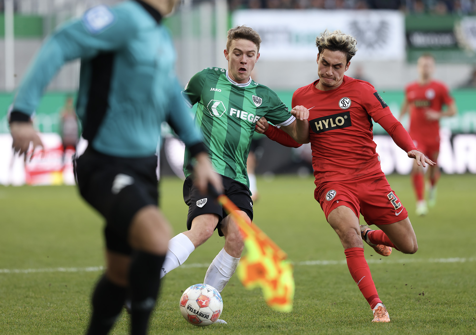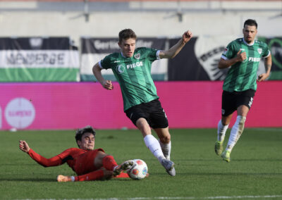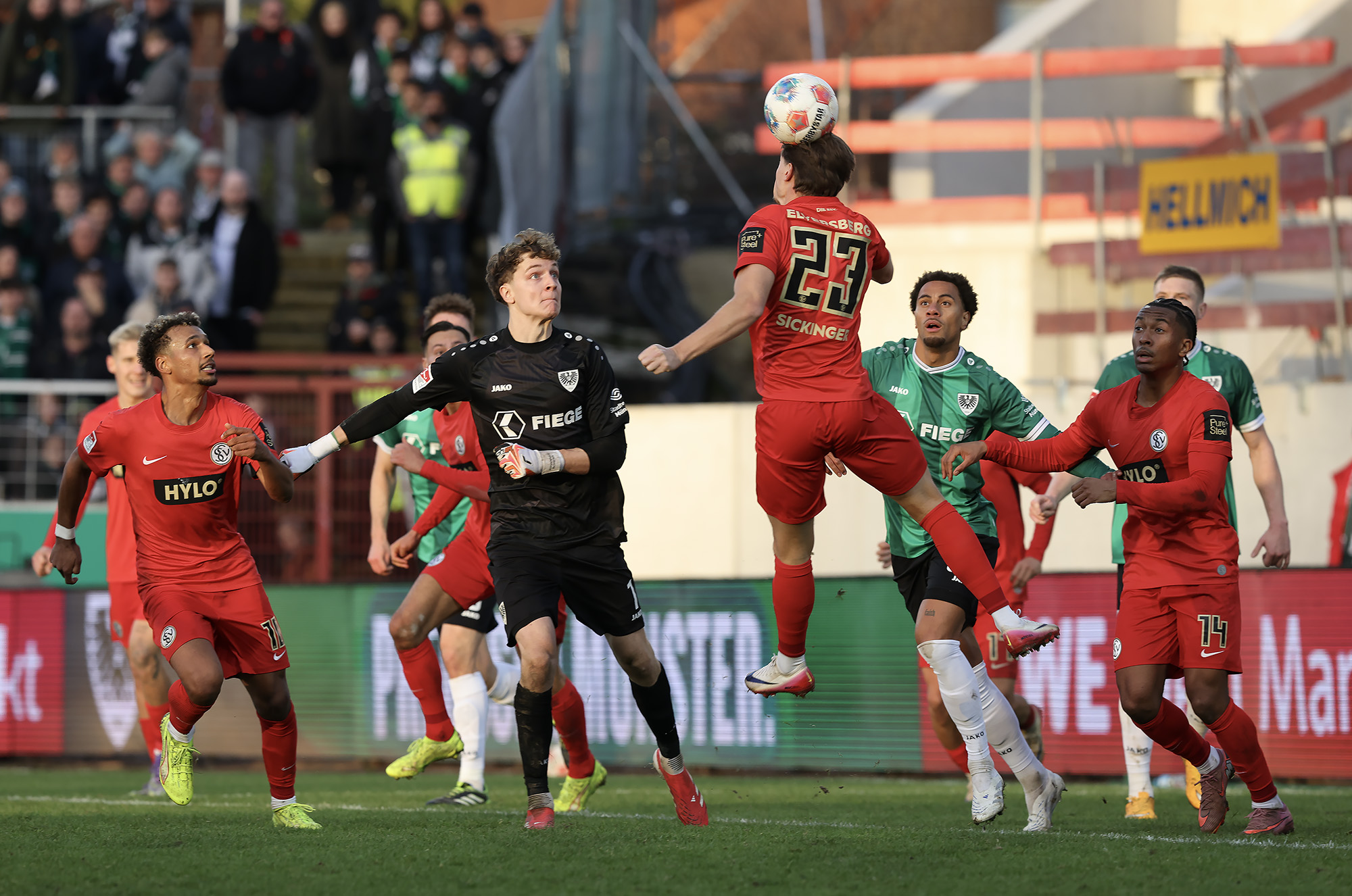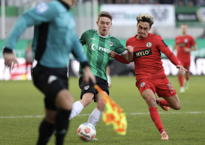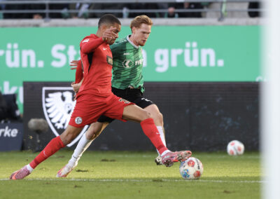 Das Aufeinandertreffen zweier Mannschaften, die mutig den Weg nach vorne suchen, versprach viele Torraumszenen. Dieses Versprechen hielten vor allem die Gastgeber in einer furiosen Anfangsphase ein. Gerade einmal 64 Sekunden waren gespielt, da prüfte Jorrit Hendrix den Elversberger Schlussmann Nicolas Kristof das erste Mal. Bei den darauffolgenden Eckbällen fehlte sowohl Luca Bolay als auch Marcel Benger nicht viel zur Führung (3.). Kurz nach dem auch die Gäste ihre erste Chance durch Lukas Petkov verbuchten (5.), rollte der Preußenzug schon wieder an. Schiedsrichter Felix Wagner zeigte nach langer VAR-Überprüfung auf den Punkt, zuvor wurde Bolay im Strafraum eindeutig am Fuß getroffen (7.). Auf den Jubel folgte der Dämpfer: Erst parierte Kristof den fälligen Strafstoß von Oliver Batista Meier (10.), dann schaffte es die „ELV“ bei der darauffolgenden Ecke im Kollektiv eine Dreifachchance des SCP zu vereiteln (11.).