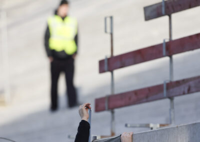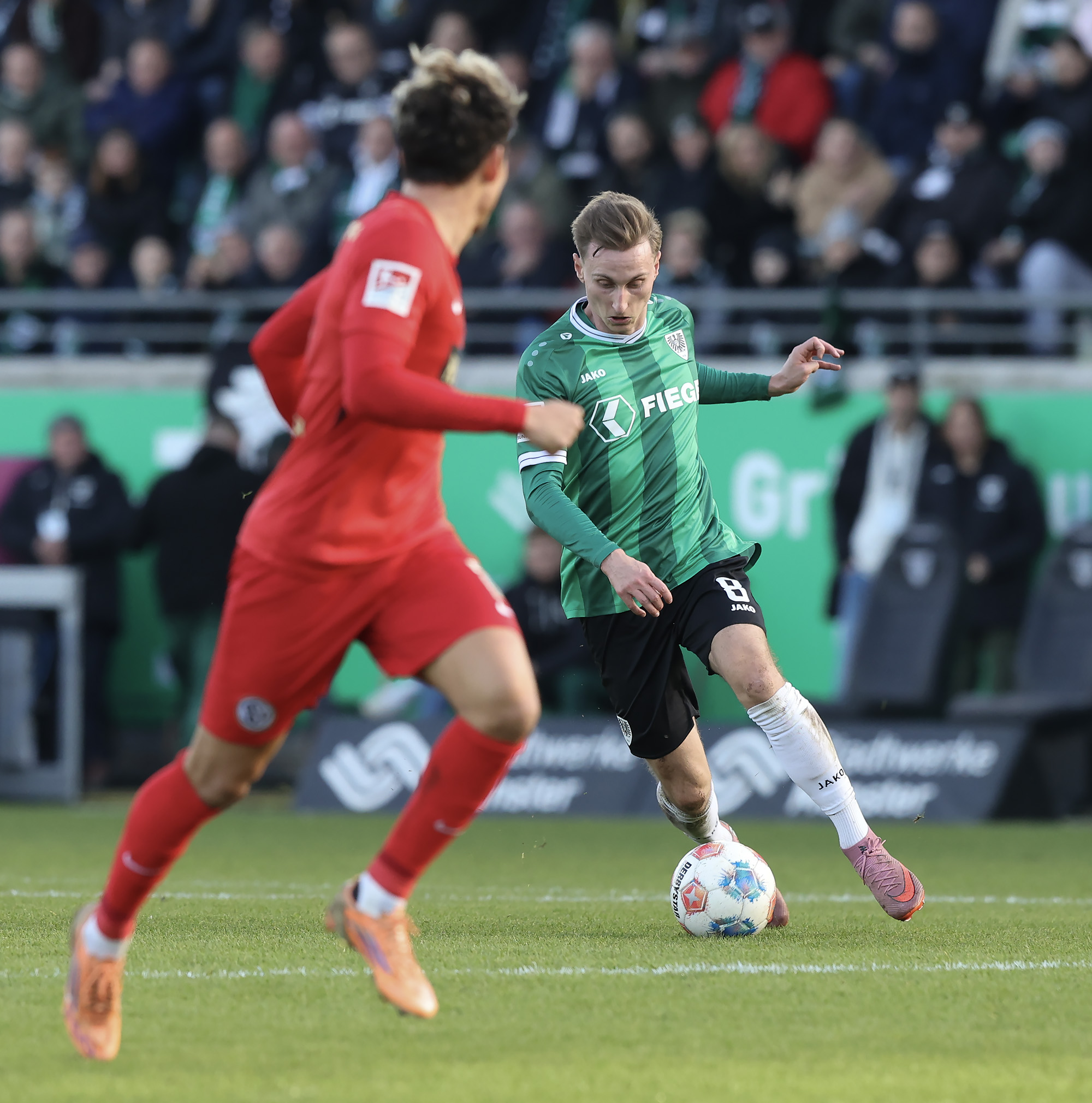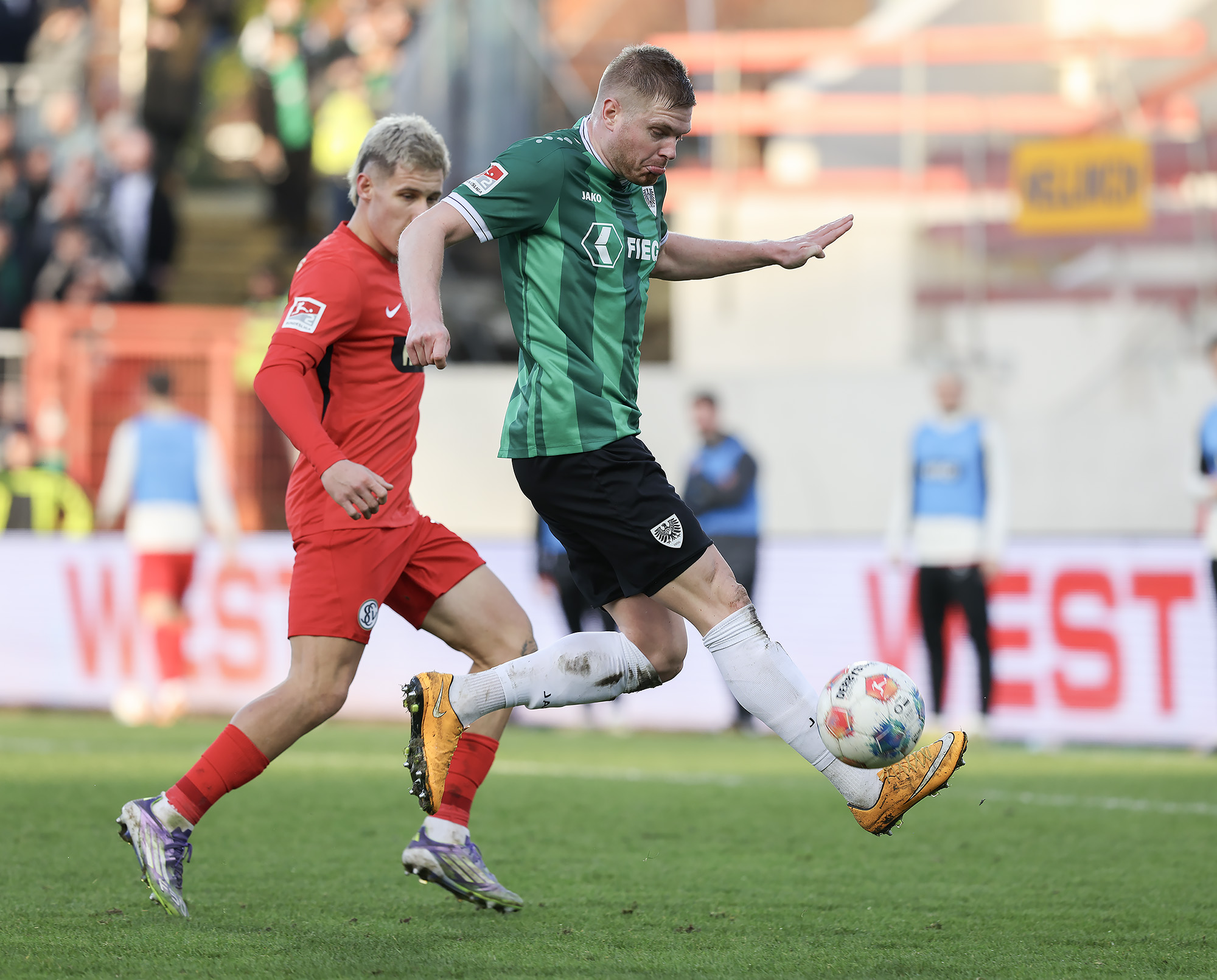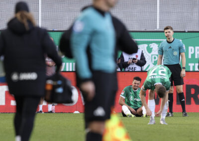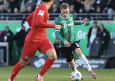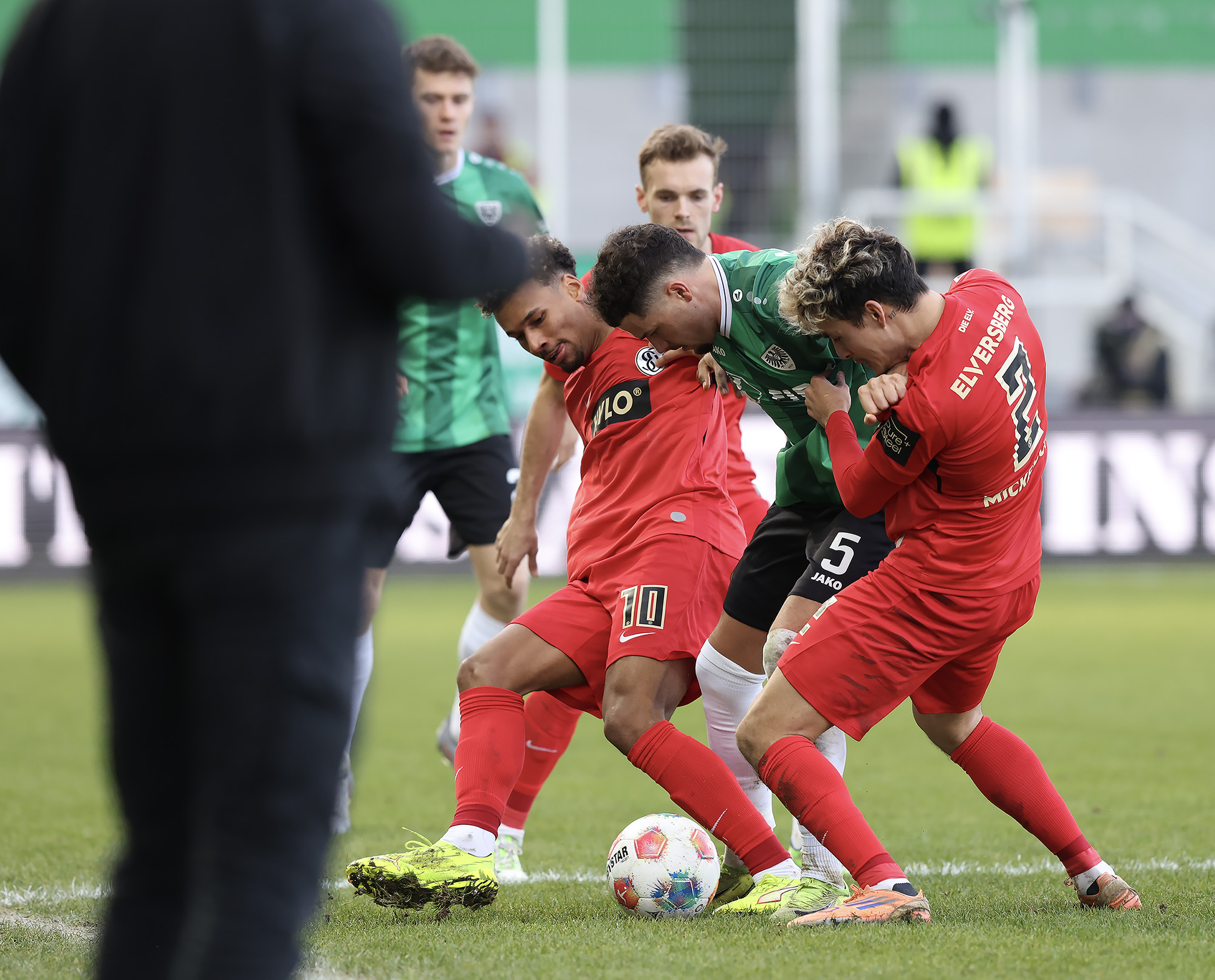 Das Aufeinandertreffen zweier Mannschaften, die mutig den Weg nach vorne suchen, versprach viele Torraumszenen. Dieses Versprechen hielten vor allem die Gastgeber in einer furiosen Anfangsphase ein. Gerade einmal 64 Sekunden waren gespielt, da prüfte Jorrit Hendrix den Elversberger Schlussmann Nicolas Kristof das erste Mal. Bei den darauffolgenden Eckbällen fehlte sowohl Luca Bolay als auch Marcel Benger nicht viel zur Führung (3.). Kurz nach dem auch die Gäste ihre erste Chance durch Lukas Petkov verbuchten (5.), rollte der Preußenzug schon wieder an. Schiedsrichter Felix Wagner zeigte nach langer VAR-Überprüfung auf den Punkt, zuvor wurde Bolay im Strafraum eindeutig am Fuß getroffen (7.). Auf den Jubel folgte der Dämpfer: Erst parierte Kristof den fälligen Strafstoß von Oliver Batista Meier (10.), dann schaffte es die „ELV“ bei der darauffolgenden Ecke im Kollektiv eine Dreifachchance des SCP zu vereiteln (11.).