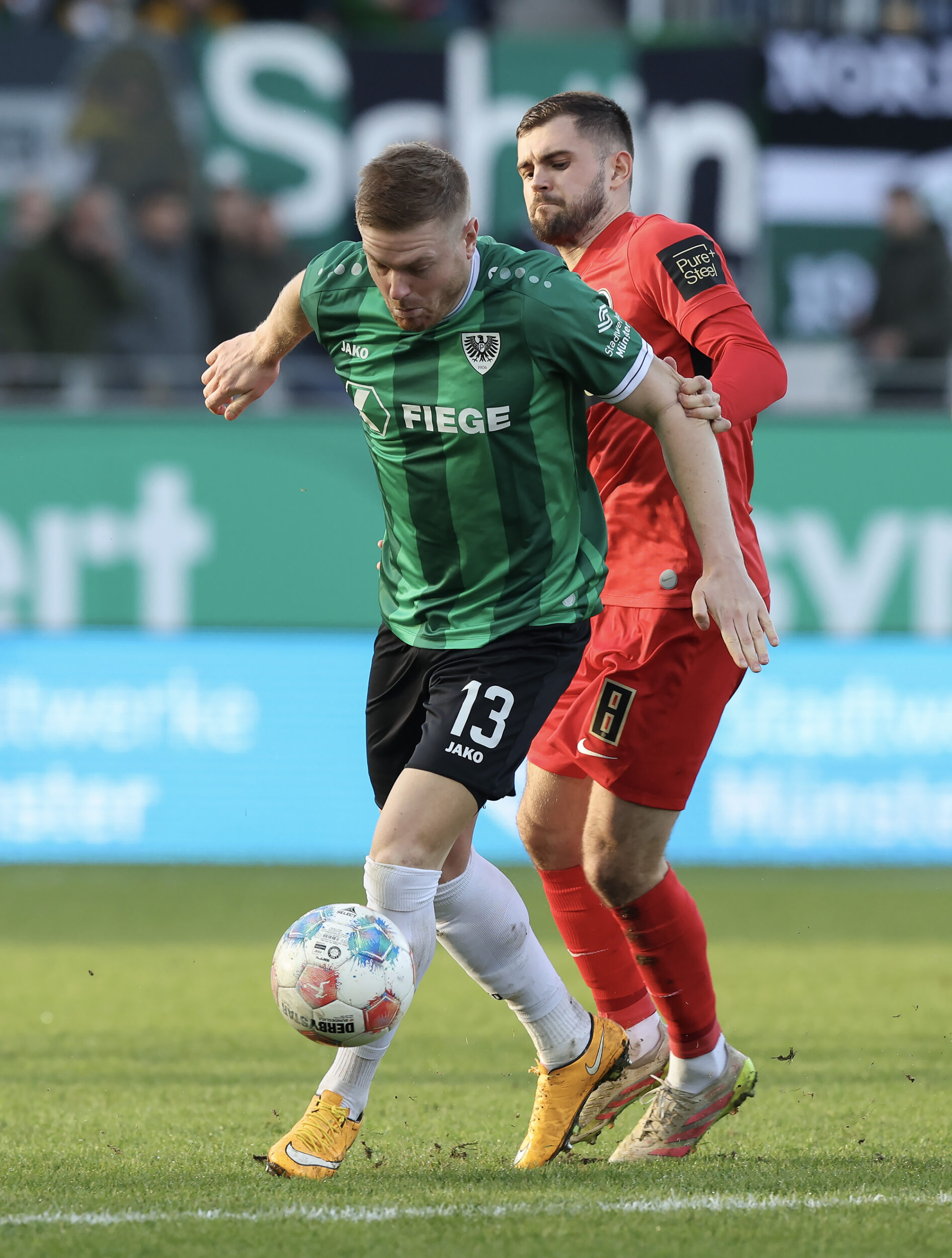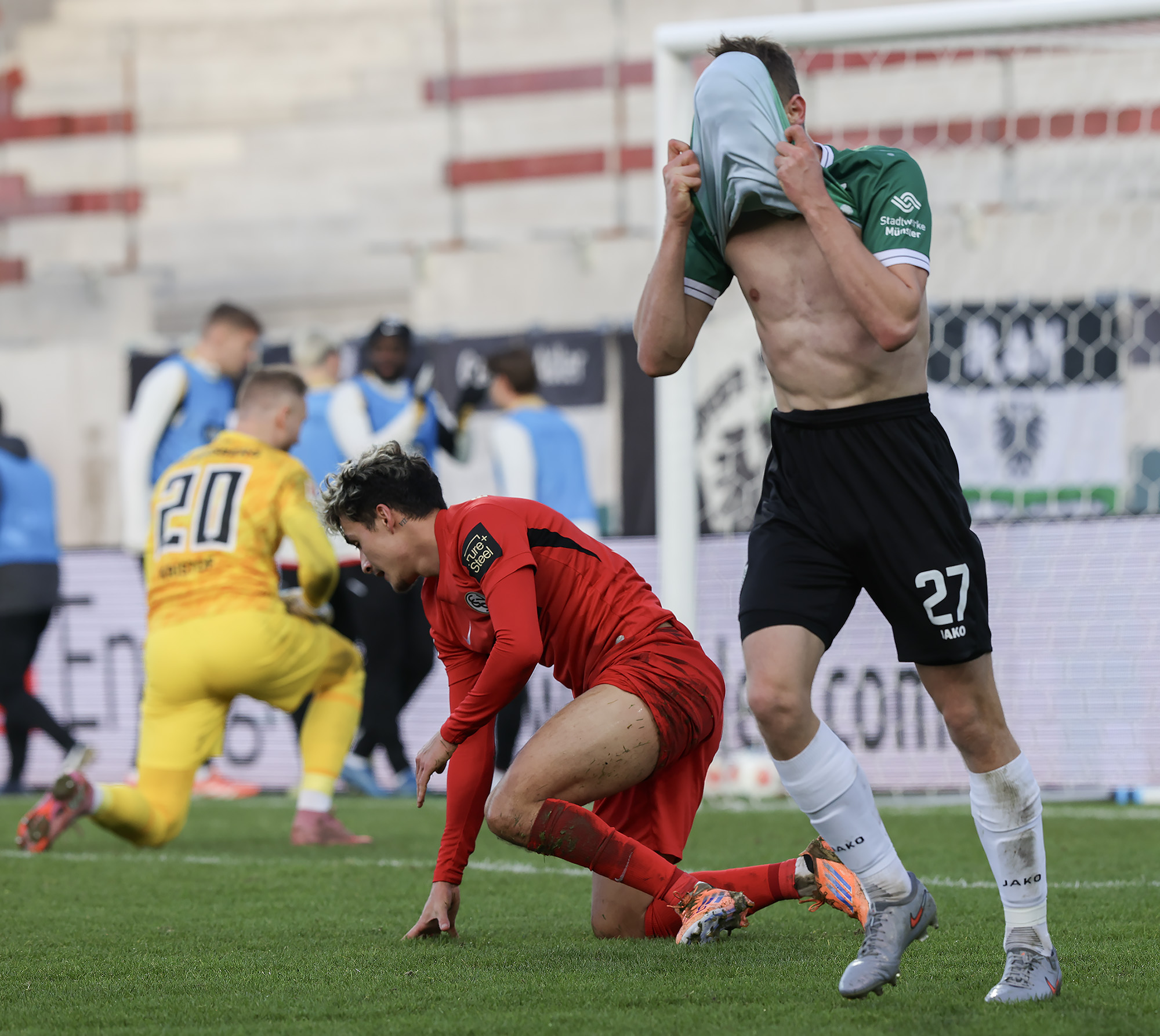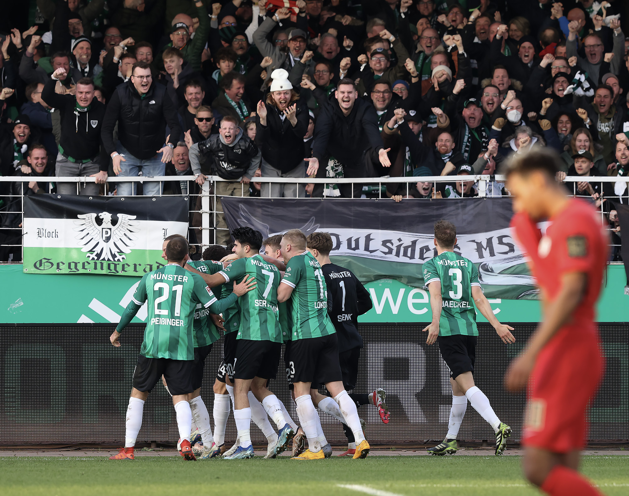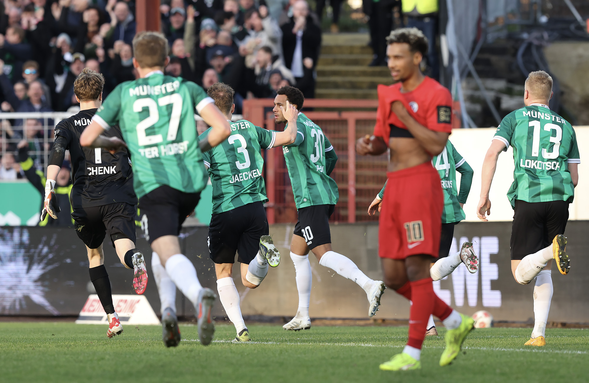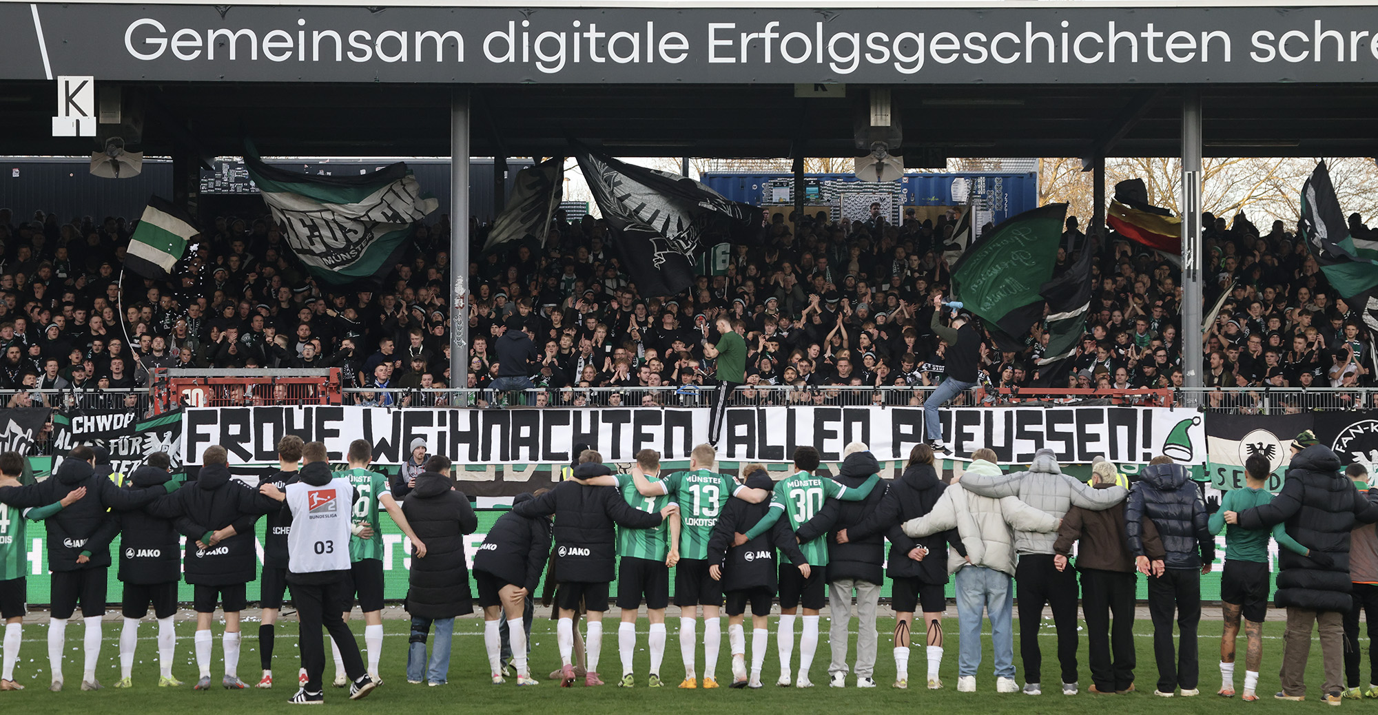 Nach dem Seitenwechsel entwickelte sich zunächst ein offener Schlagabtausch, der mit einer guten Gelegenheit für die Gäste begann: Jano ter Horst war gegen Conté Bambasé jedoch gerade noch rechtzeitig da (51.). Anschließend waren die Hausherren wieder dran: ter Horst bediente zunächst Mees, der jedoch nicht genügend Druck auf dem Ball bekam (52.). Kurz darauf zog das Münsteraner Eigengewächs selbst knapp am langen Pfosten vorbei (53.). Der SCP investierte viel, drang in der Folge aber nur selten ins letzte Drittel vor. Dadurch eröffneten sich dem Gegner Räume zum Kontern – die dieser auch zu nutzen versuchte. Gleich dreimal hielt Schlussmann Johannes Schenk seine Teamkollegen im Spiel (63., 68. und 84.) – die Sportvereinigung war im zweiten Durchgang dem 0:2 näher als Münster dem Ausgleich. Nachdem der eingewechselte Zidan Sertdemir per Direktversuch knapp vorbeizog (90.+1), schien es so, als würde diesmal der Lucky Punch ausbleiben. Doch einen Schachzug hatten die Preußen noch in der Hinterhand: Eine Einwurfflanke vom ebenfalls eingewechselten Torge Paetow verlängerte Paul Jaeckel für den freistehenden Joker Etienne Amenyido, der am zweiten Pfosten einnickte (90.+4) – und den Adlerträgern am vierten Advent einen verdienten Punktgewinn zum Jahresabschluss bescherte.