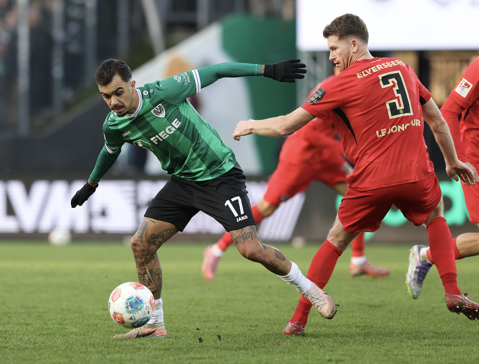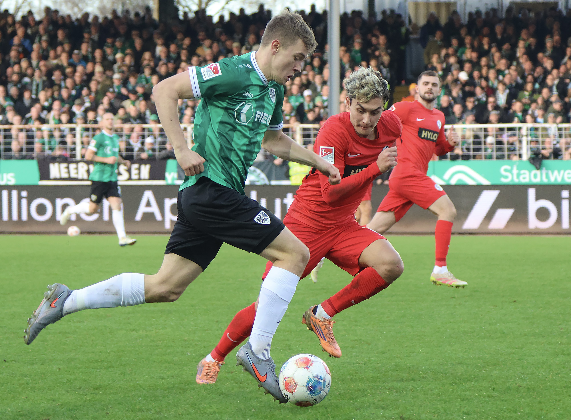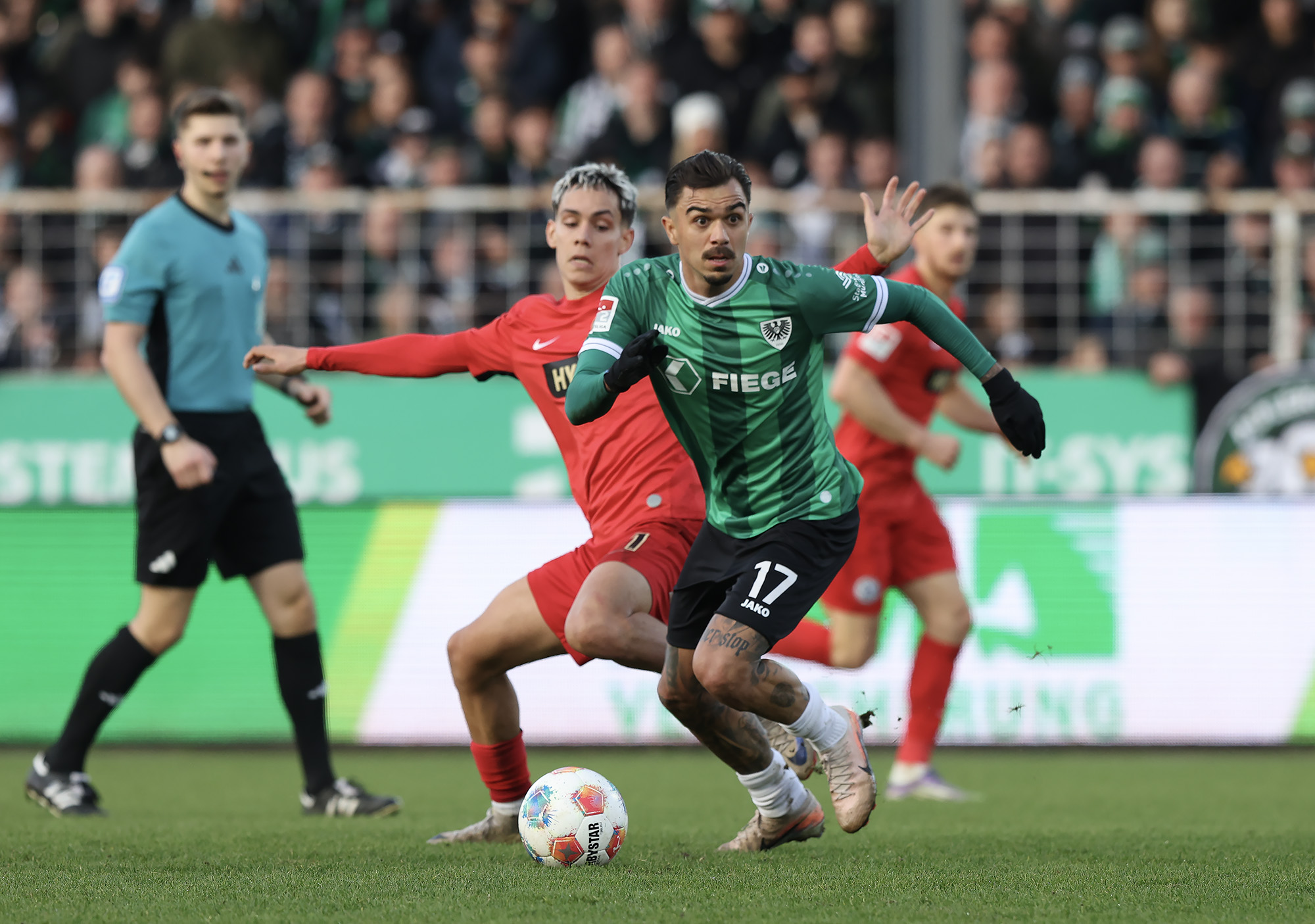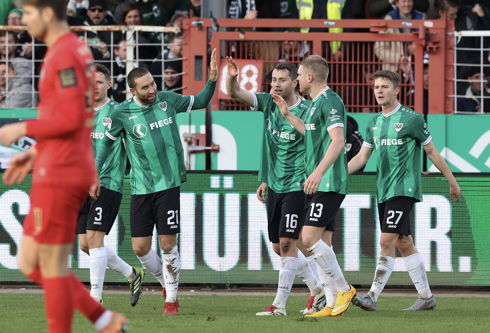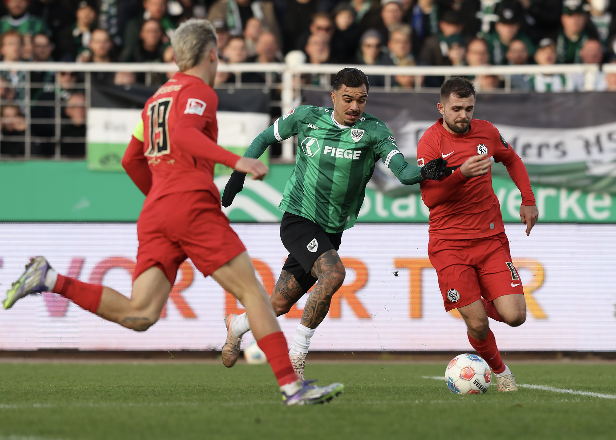 Nach dem Seitenwechsel entwickelte sich zunächst ein offener Schlagabtausch, der mit einer guten Gelegenheit für die Gäste begann: Jano ter Horst war gegen Conté Bambasé jedoch gerade noch rechtzeitig da (51.). Anschließend waren die Hausherren wieder dran: ter Horst bediente zunächst Mees, der jedoch nicht genügend Druck auf dem Ball bekam (52.). Kurz darauf zog das Münsteraner Eigengewächs selbst knapp am langen Pfosten vorbei (53.). Der SCP investierte viel, drang in der Folge aber nur selten ins letzte Drittel vor. Dadurch eröffneten sich dem Gegner Räume zum Kontern – die dieser auch zu nutzen versuchte. Gleich dreimal hielt Schlussmann Johannes Schenk seine Teamkollegen im Spiel (63., 68. und 84.) – die Sportvereinigung war im zweiten Durchgang dem 0:2 näher als Münster dem Ausgleich. Nachdem der eingewechselte Zidan Sertdemir per Direktversuch knapp vorbeizog (90.+1), schien es so, als würde diesmal der Lucky Punch ausbleiben. Doch einen Schachzug hatten die Preußen noch in der Hinterhand: Eine Einwurfflanke vom ebenfalls eingewechselten Torge Paetow verlängerte Paul Jaeckel für den freistehenden Joker Etienne Amenyido, der am zweiten Pfosten einnickte (90.+4) – und den Adlerträgern am vierten Advent einen verdienten Punktgewinn zum Jahresabschluss bescherte.